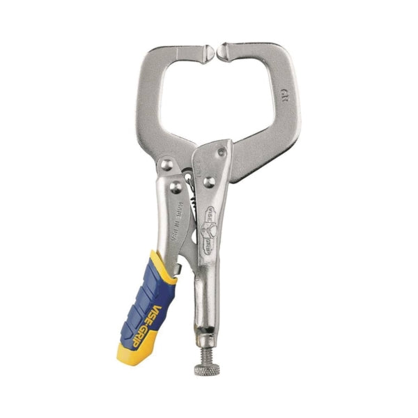 Fast Release' locking C-clamp with regular tips. Easier to open, has a no-pinch release and offers more finger room. Wide-opening jaws provide greater versatility in clamping a variety of shapes. Turn screw to adjust pressure and fit work. Stays adjusted for repetitive use. Constructed of high-grade heat-treated alloy steel for maximum toughness and durability.