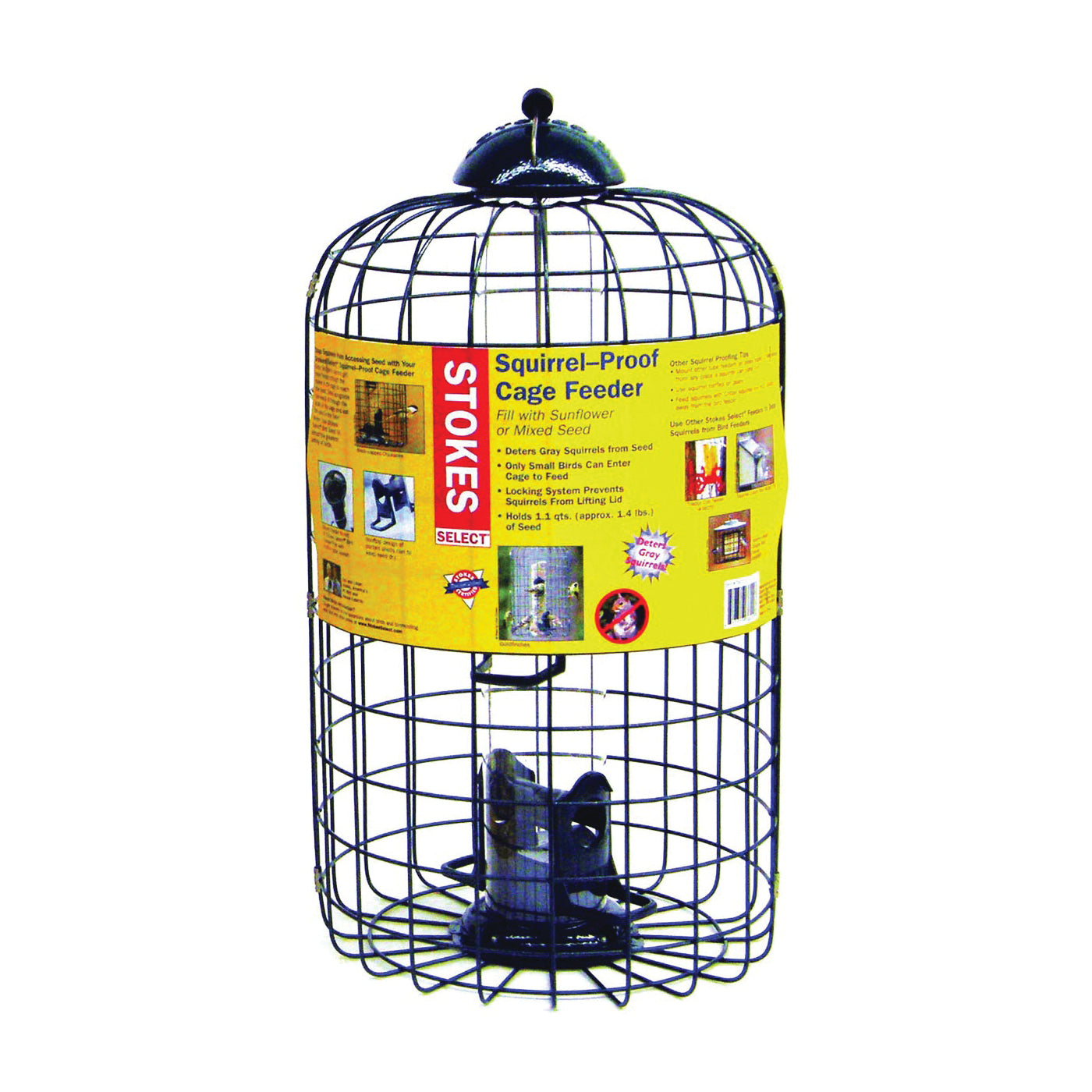 Fill with sunflower or mixed seed. Deters gray squirrels from seed. Only small birds can enter cage to feed. Locking system prevents squirrels from lifting the lid. Holds 1.1 qt (approx. 1.4 lb) of seed.