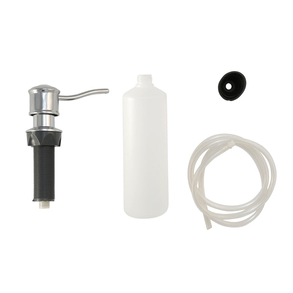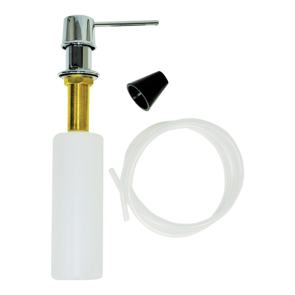 This Danco chrome soap dispenser with curved nozzle provides an elegant touch for a bathroom or kitchen installation. Add convenience to your kitchen with this dispenser as it comes with a 48 in hose that will fit a 1 gal soap or 12 oz lotion bottle discreetly hidden underneath the sink to minimize refills. This dispenser can also be filled from the top if used with the included under counter plastic soap container. The longer shank fits most counter tops, including granite and marble.