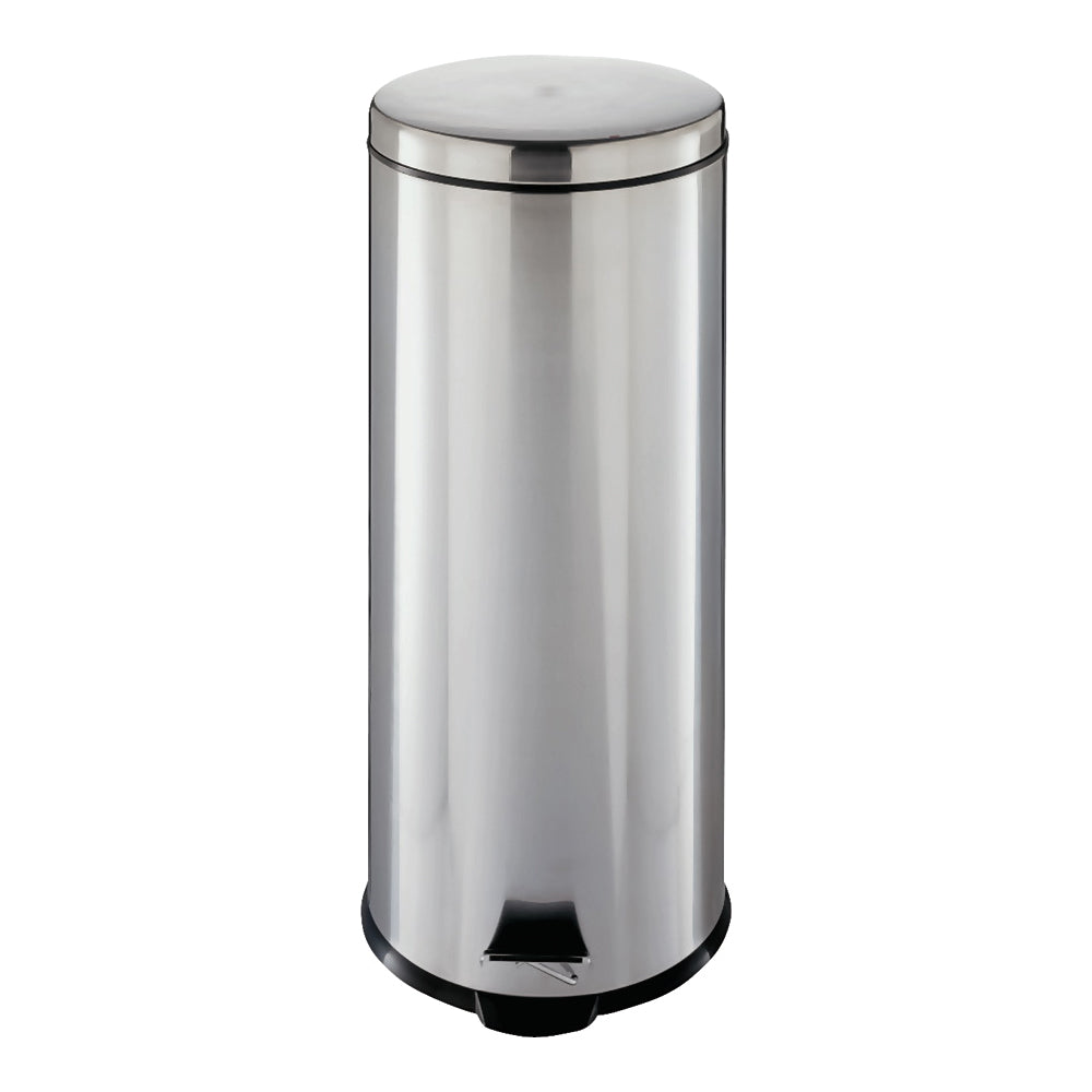 The Simple Spaces trash can has a 7.93 gal capacity. Its made of stainless steel. The dimensions are 11-1/2 in D x 26 in H.
