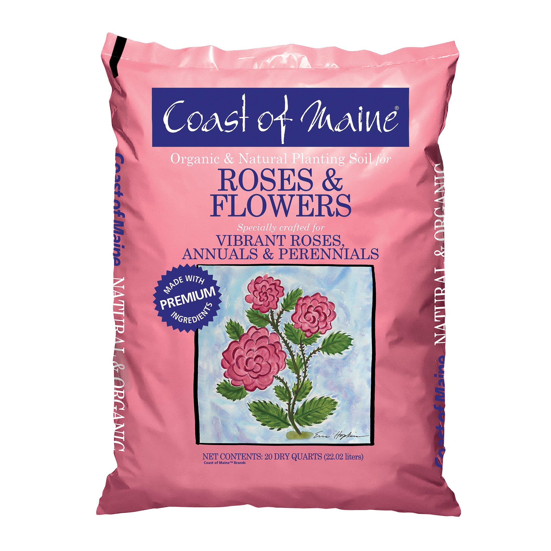 Coast of Maine's natural and organic soil for roses and flowers is specially crafted for all rose varieties, flowering shrubs, annuals and perennials. The soil is made with premium ingredients, it contains compost, peat moss, aged bark and lime.