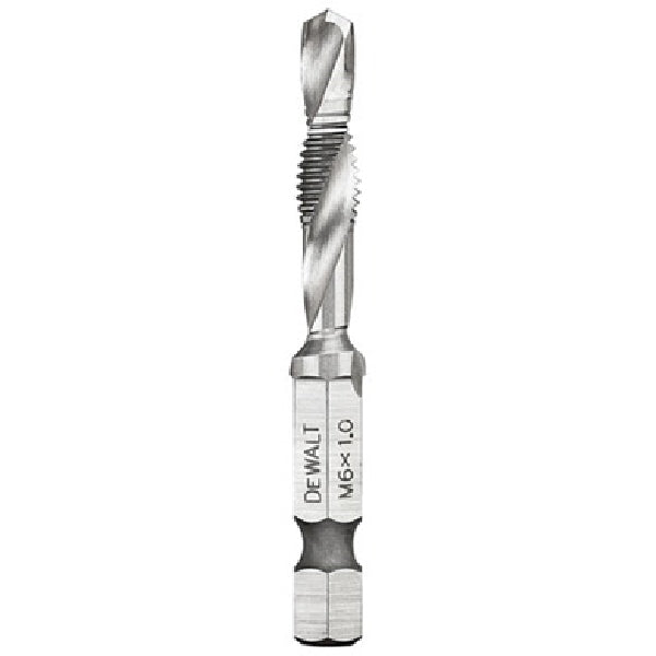 DEWALT IMPACT READY Tap and Drill Bit, 6 mm Dia, Flute Type: Spiral, Number of Flutes: 3, Shank Type: Hex, Shank Size: 1/4 in, Cutting Direction: Right Hand, HSS, Bright, 2-21/64 in L