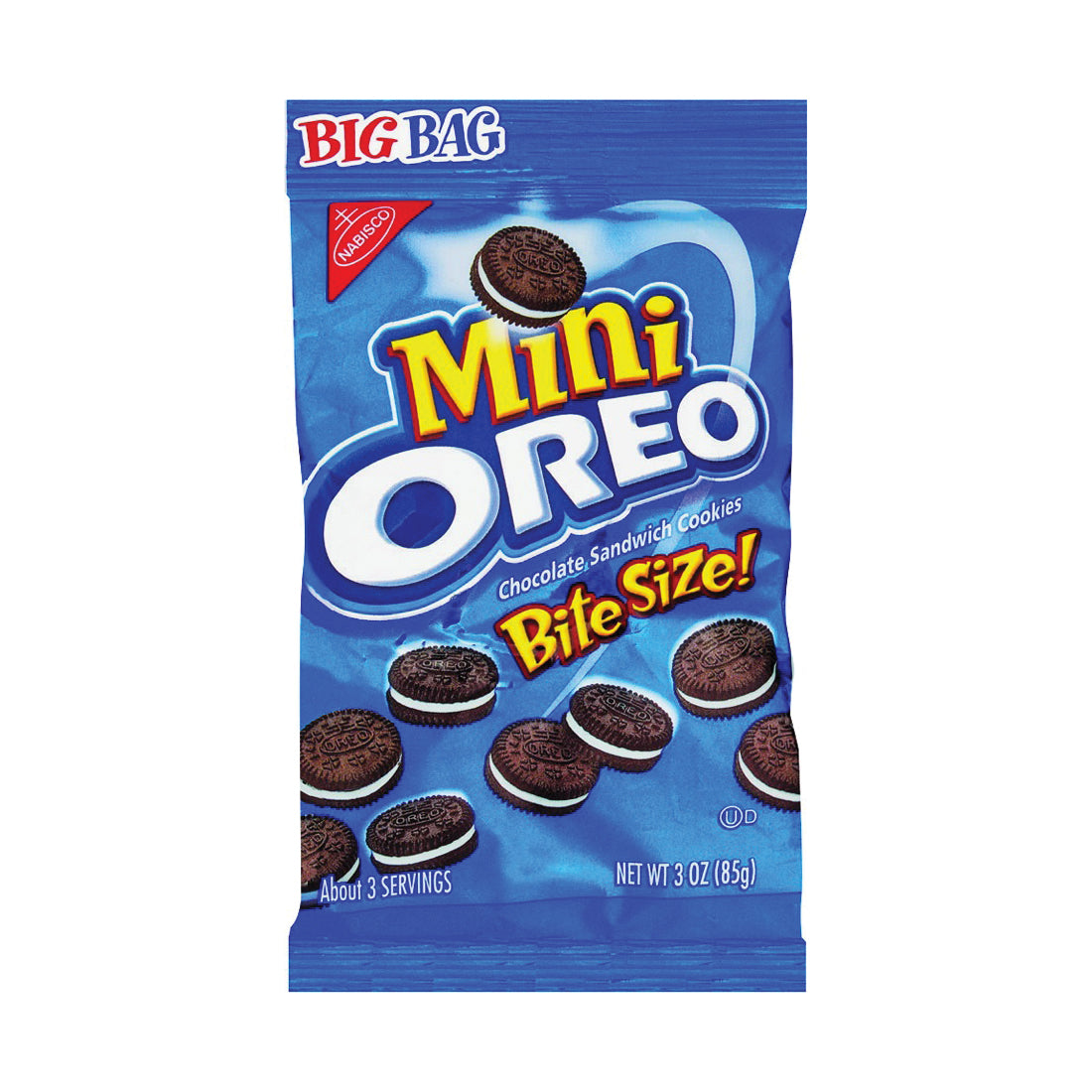 Mini Oreo chocolate bite size sandwich cookie. 3 oz bag.