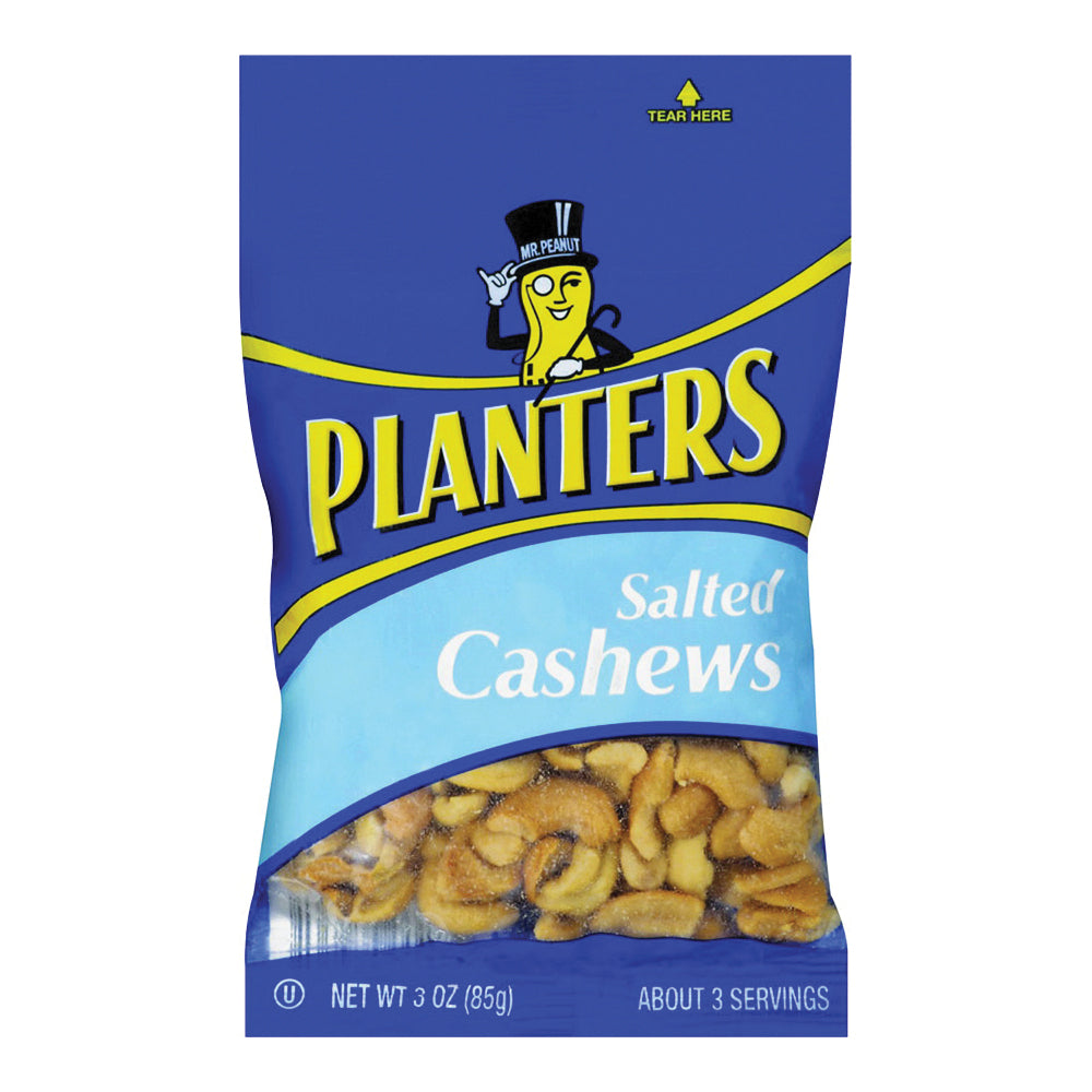 Planters Cashew, Bag, Net Content: 3 oz, Nutritional Information: 160 Calories, 68.8 Calories from Fat, 13 g Total Fat, 2 g Saturated Fat, 115 mg Sodium, 7 g Total Carbohydrate, 2 g Dietary Fiber, 4 g Sugar, 6 g Protein, 0% Vitamin A, 0% Vitamin C, 2% Calcium, 6% Iron, Ingredients: Cashews, Peanut and Cottonseed Oil, Sea Salt