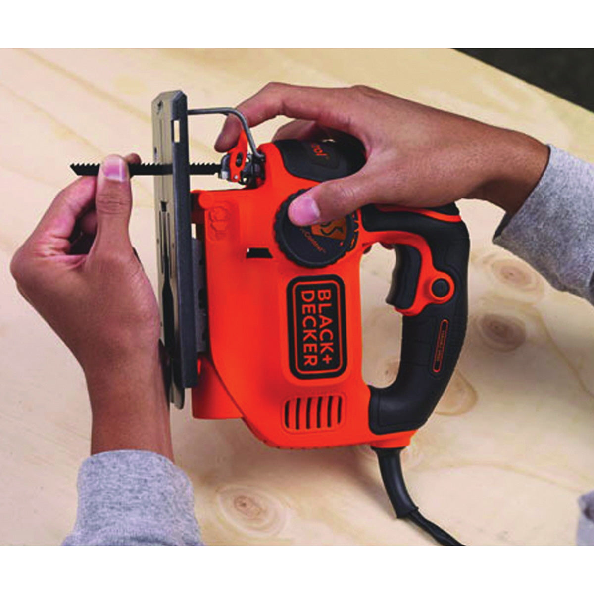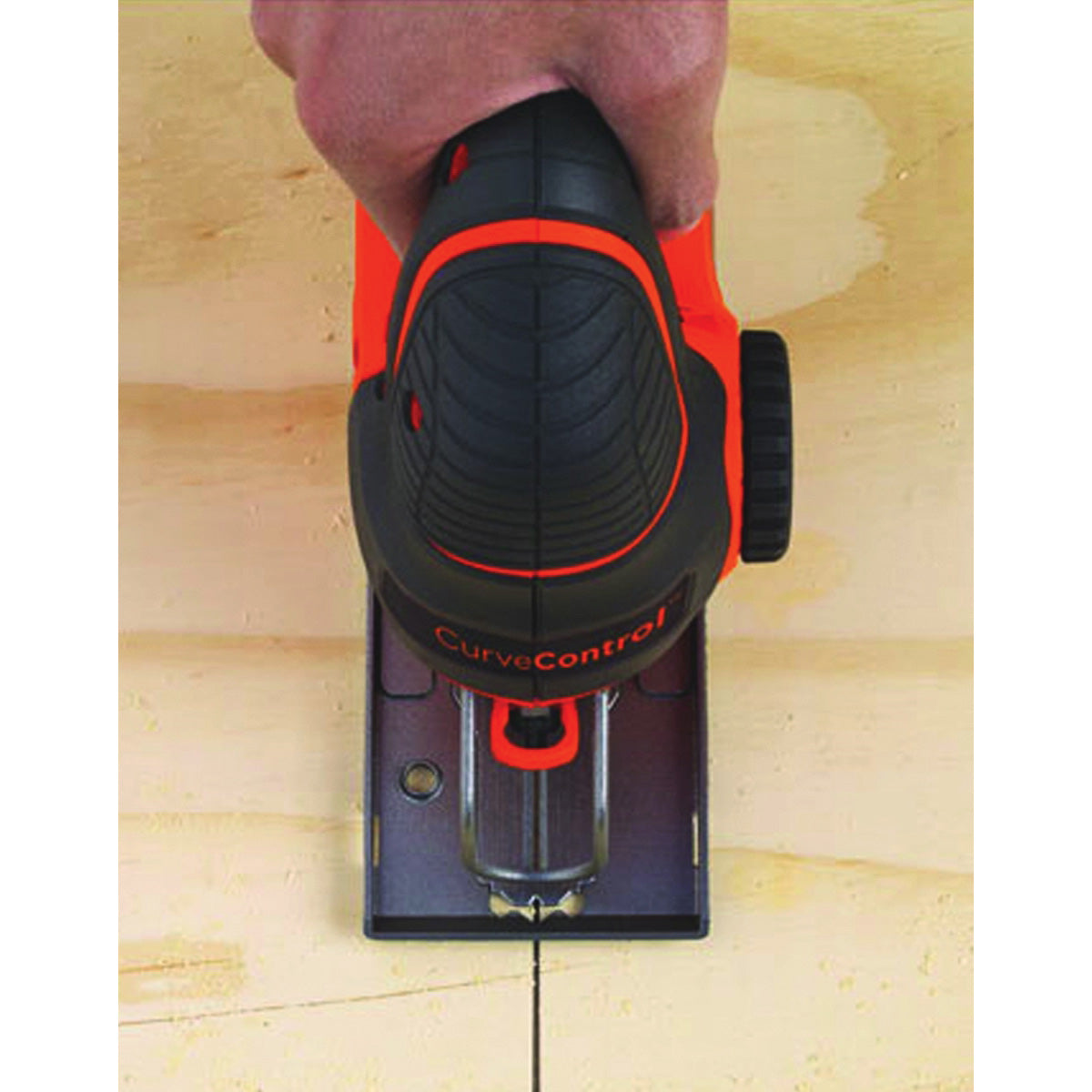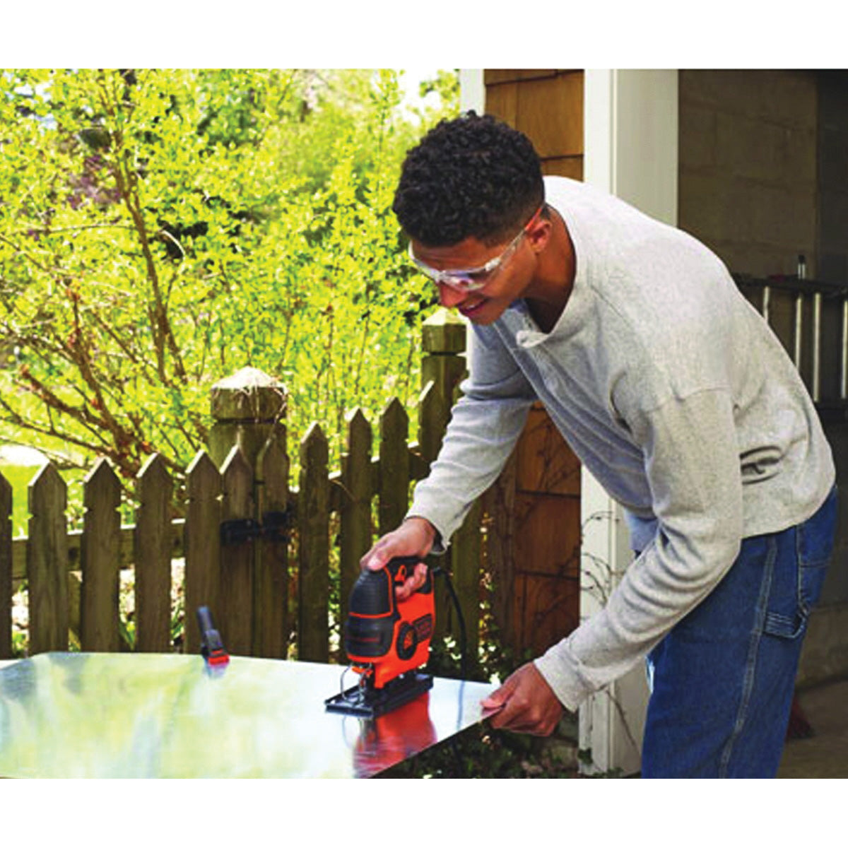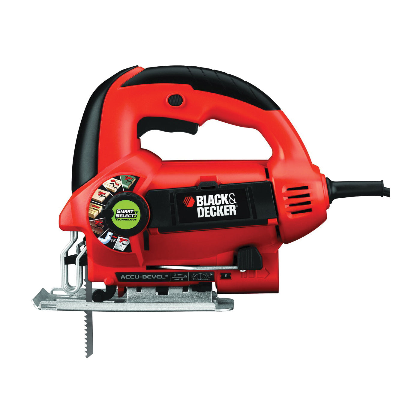 Electronic variable speed and variable speed orbital jigsaw with SmartSelect technology, SmartSelect dial. Choose your project icon and the jigsaw automatically adjusts the orbital setting and recommends speed for your cut, 7 orbital settings to match any cutting application, accu-bevel angle adjustment provides accurate bevel adjustment with quick action lever and indicator window, tool-free blade change, magnetic blade storage, accepts T and U shank blades. Rated at 800 to 3000 spm, stroke length is 3/4 in, keyless blade clamp. Includes one blade.