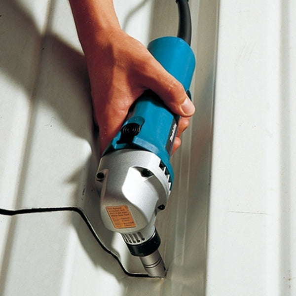 Clean and precise work in keystone plate, deck plate and other corrugated sheet materials. Die rotates 360 deg. Large 1/4 in stroke. Ergonomic, slim body design for easy gripping. Extremely light (weighs only 3.6 lb) for easy handling. Lock-on sliding switch for continuous operation. Built-in thickness gauge for convenience. Easy punch and die replacement for reduced down time. Double insulated. Rated at 2200 spm. Minimum cutting radius for outside edge 2 in outside edge. Inside edge is 1-3/4 in. Overall length of 10-1/4 in. Included wrench and hex wrench.