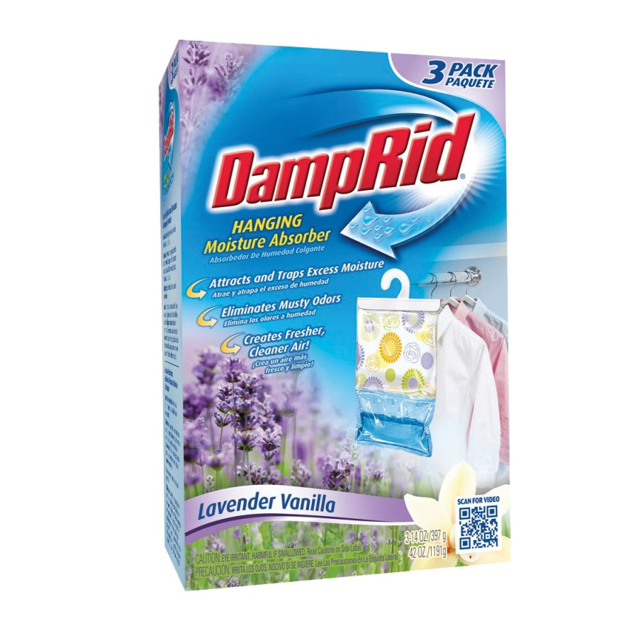 DampRid Moisture Absorber, 14 oz Net Content, Pellet Form, Lavender Vanilla Odor/Scent, White, Compositions: Calcium Chloride, Sodium Chloride, Potassium Chloride, 2.15 Specific Gravity, Melting Point: 369 to 1420 deg F, 350 to 3500 deg F Boiling Point, 15.4 lb/gal Density, Pillow Pack Dispenser