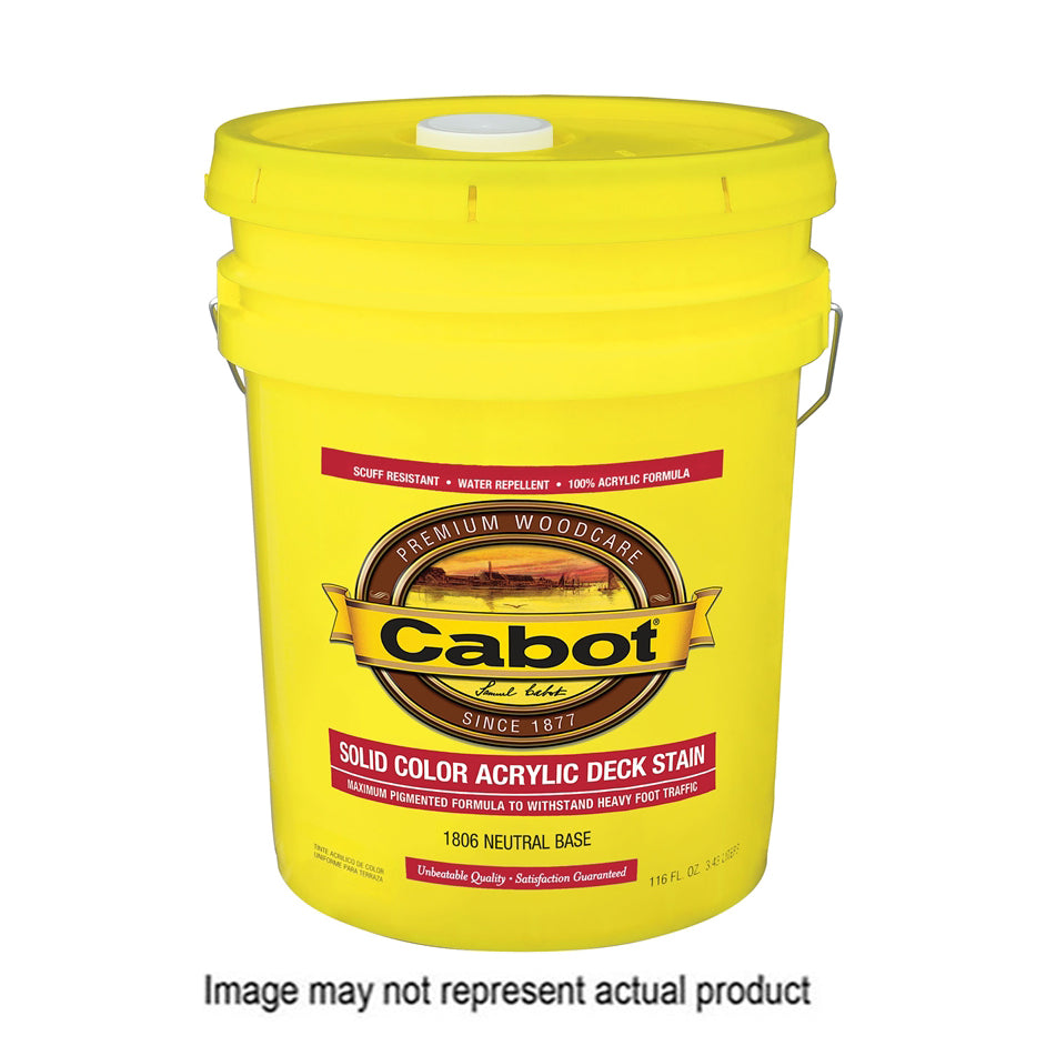 Cabot Solid Stain, Net Content: 5 gal, Can, Liquid, Sheen: Low Luster, Viscosity: 85 to 95 ku, Pigment Type: Iron Oxide, Light Fast Organic, Silica, Titanium Dioxide, Vehicle Type: Acrylic Polymer, 400 to 500 sq-ft/gal Coverage Area, VOC Content: <100 g/L, Application Method: Brush, Spray, Stain Pad, Temperature Rating: <50 deg F, Density: 9.2 lb/gal, Applicable Materials: Wood, Drying Time: 4 to 6 hr, Base Type: Water