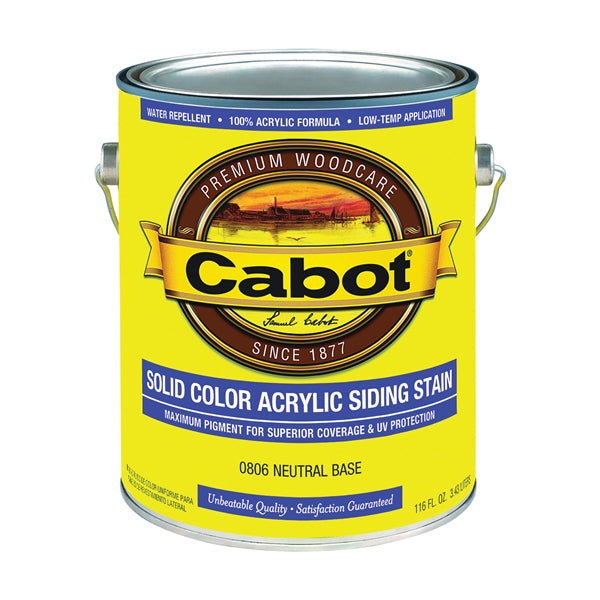 Cabot® solid color acrylic siding stain is an advanced technology, 100% acrylic solid color stain formulated to have great performance properties for the professional user. Solid color acrylic siding stain is a heavily pigmented and exceptionally thick wood siding stain, delivering greater opacity than conventional solid color stains. The result is smoother spread, better coverage and superb handling when applied by either brush or sprayer. In addition, this product has been developed and tested for use in colder temperatures, extending the exterior maintenance season for professionals in cooler climates. Cabot® solid color acrylic siding stain covers previously painted or stained surfaces in just one-coat, improving project completion time and maximizing labor efficiencies. Cabot® solid color acrylic siding stain is so advanced it does not require the use of a primer coat on non-extractive-prone wood species such as pine, white cedar or cypress.