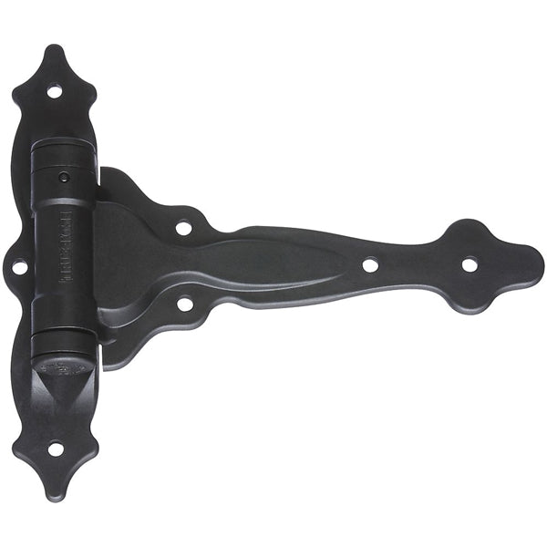 National Hardware Decorative Spring T-Hinge, 27.5 lb Weight, Door Leaf Height: 7-3/4 in, Door Leaf Width: 8-1/2 in, Number of Mounting Holes: 6, Polymer, Black