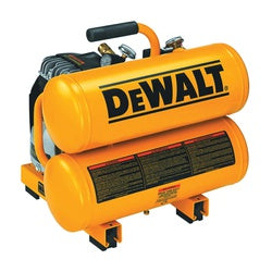 DEWALT Portable Electric Air Compressor, Tool Only/Battery Included: Tool Only, 120 V, 1.1 hp, 14 A, Frequency Rating: 60 Hz, Number of Stages: 1, Outlet Connection Size: 1/4 in, Tank Type: Twin Stack, Tank Capacity: 4 gal, 125 psi, Air Flow Rate: 3.2 cfm, 3400 rpm, Sound Level: 83 dBA, Motor Type: Induction, Pump Type: Oil-Lubricated, Drive Type: Direct, Cast Iron, Dimensions: 18-1/2 in L x 15 in W x 16-3/4 in H, Includes: Compressor Oil