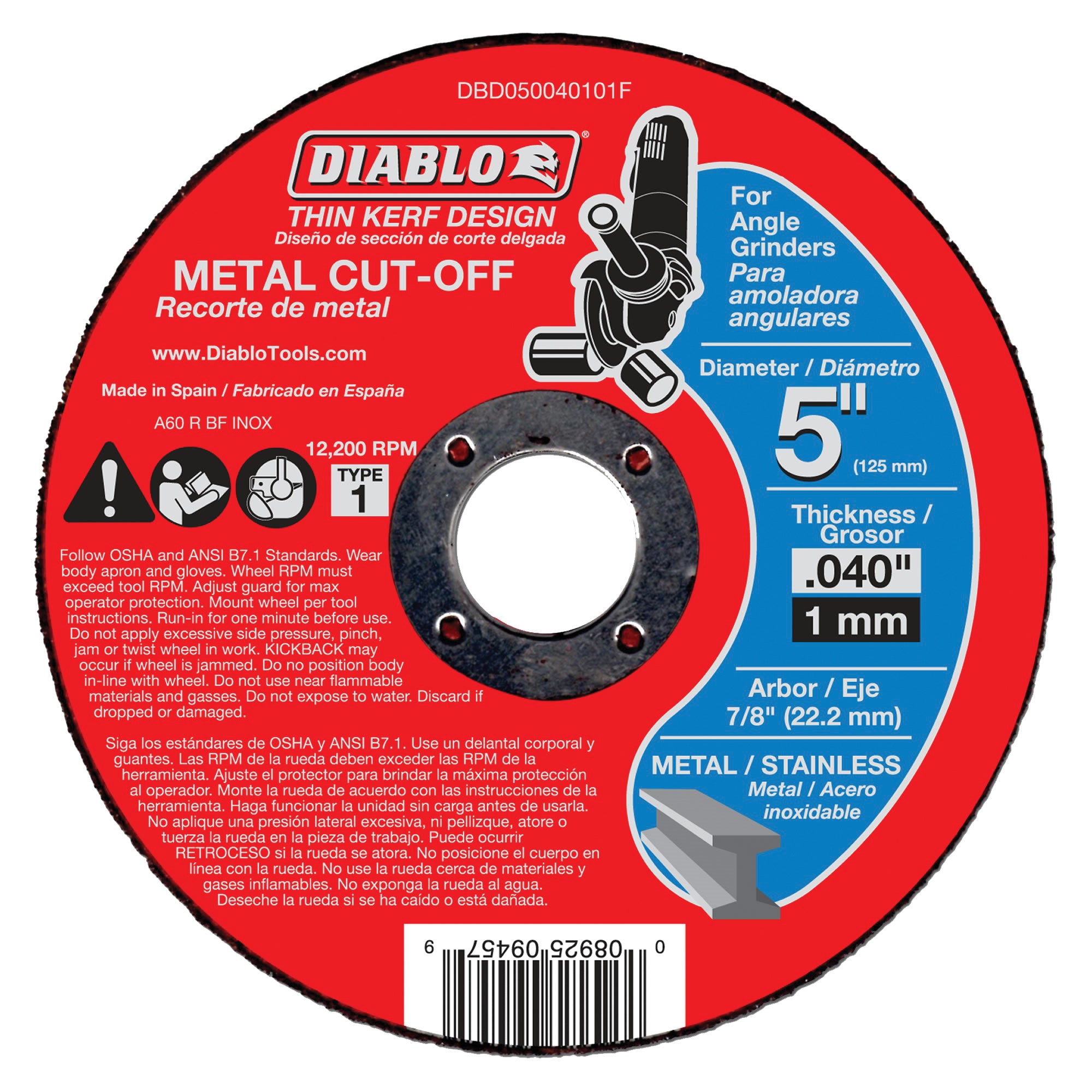 Diablo premium metal cut-off discs provide great performance and increased productivity. Featuring a premium aluminum oxide blend, these discs cut through material faster than other cut-off discs and offer an extra-long cutting life. Diablo thin kerf design provides for a thin, fast cut with minimal burr formation. Unlike other bonded discs on the market, this cut-off disc is a true 4 in design. Fully reinforced for use in hand-held cut-off work. Ideal for use when working in hard-to-reach areas.