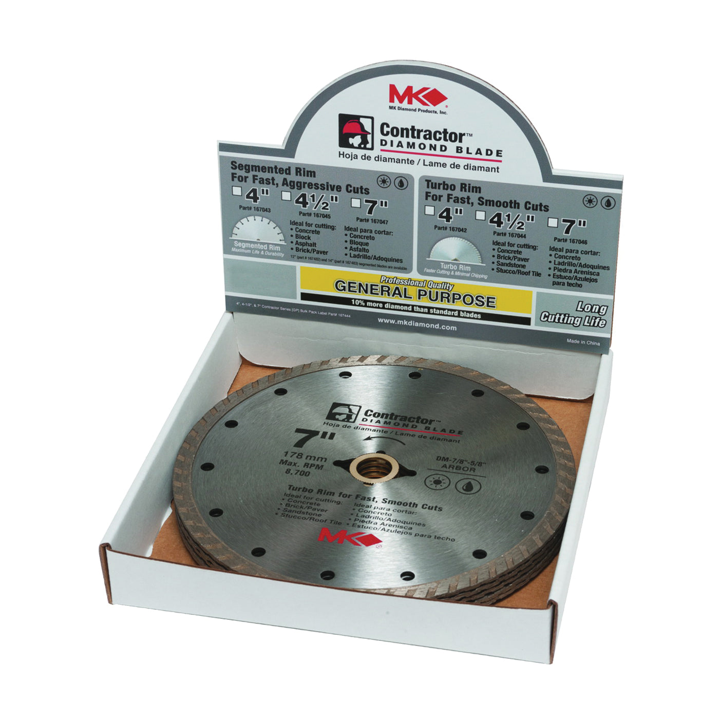 These diamond blades contain 10% more diamond than standard blades, providing long life. Turbo rim for fast, smooth cuts. Cuts concrete, brick, paver, sandstone, stucco and roof tile.