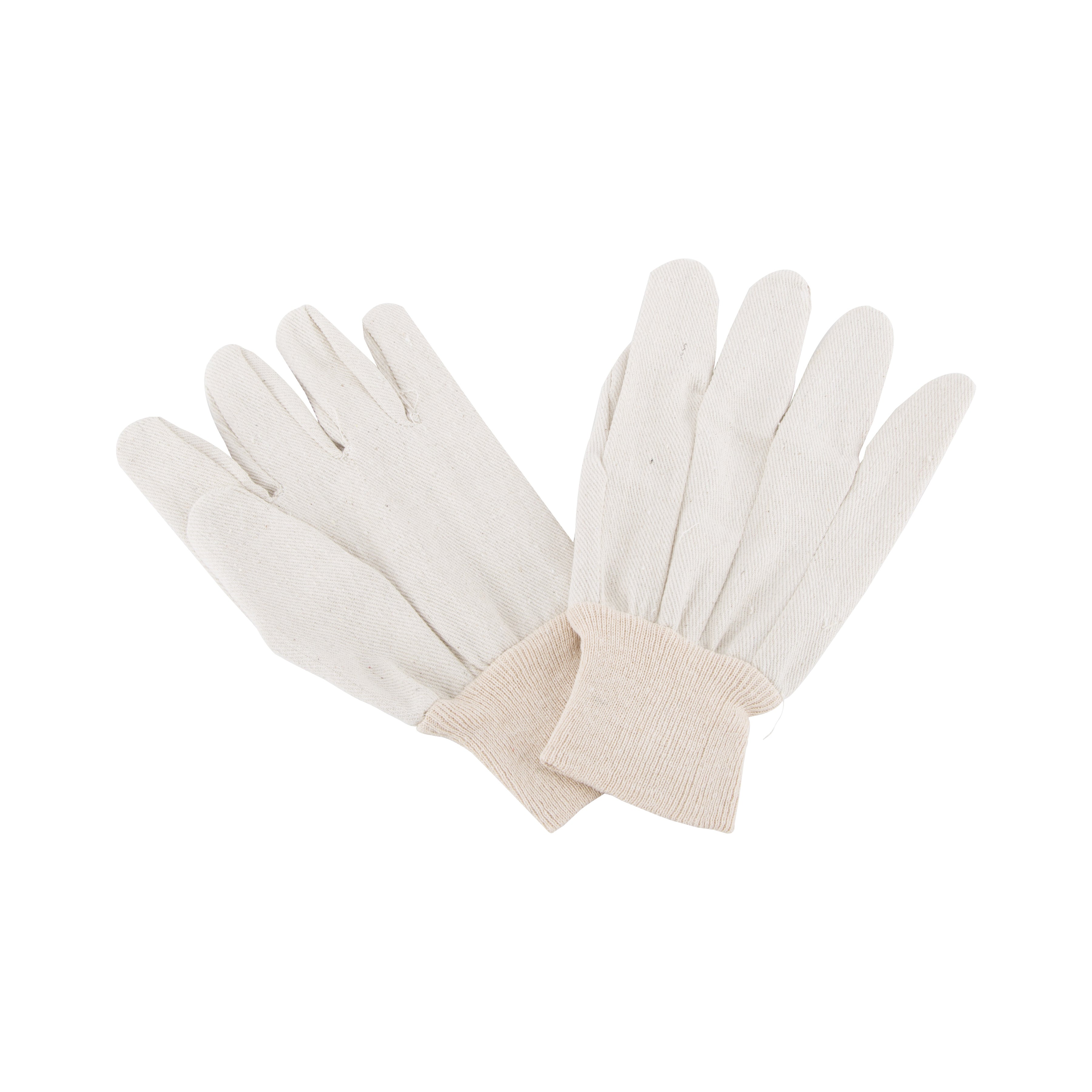 Clute-cut work gloves feature straight thumb, knit wrist cuff, 70% cotton and 30% polyester fabric.