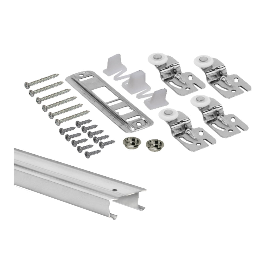 BP210K Bypass door hardware kit includes the hardware required to install two panels into a closet opening. Includes solid aluminum J-track able to hold 60 lb per panel and hangers. Easy to install and built for years of problem free use. Available in various lengths.