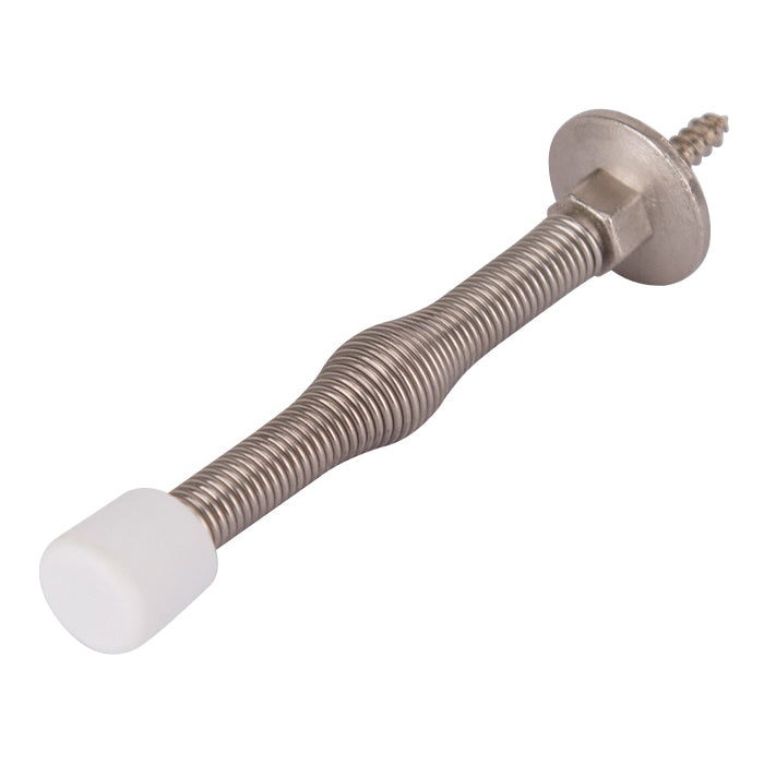 The satin nickel solid doorstop is a simple way to help prevent any damage to walls and objects behind the door. The doorstop features solid material and a long projection.