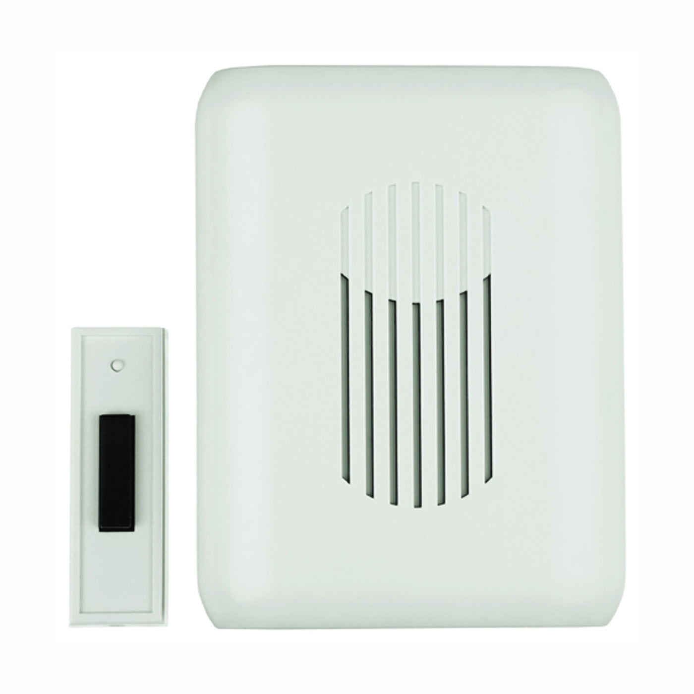 Battery operated. 3 sound options set at chime button, uses two 3 V lithium batteries (installed), different sounds for front and back doors. 32 changeable codes to prevent interference, adjustable volume. Paintable doorbell button for a custom look. Up to 150 ft operating range. Double-sided tape, screws, wall anchor provided. Chime uses 4 alkaline C batteries (not included).