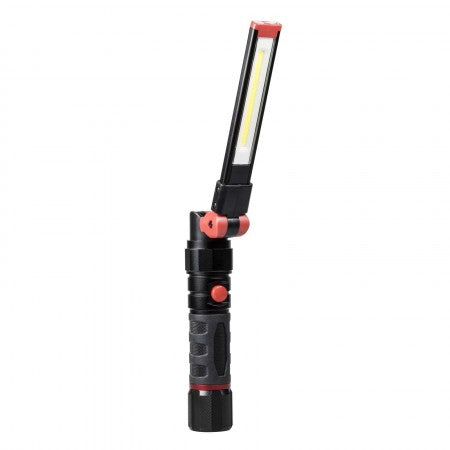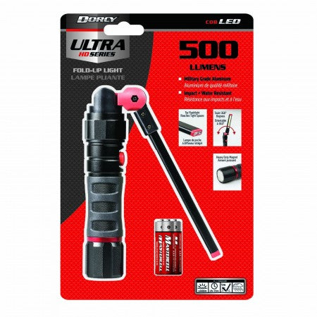 Dorcy Foldable Flashlight, Lamp Type: LED, Battery Type: Alkaline, Battery Size: AAA, Number of Batteries: 3, Lumens: 500, Run Time: 2 hr, Body Material: Aluminum, Switch Type: Push Button, Black/Red, Beam Distance: 20 m, Includes: (3) AAA Batteries