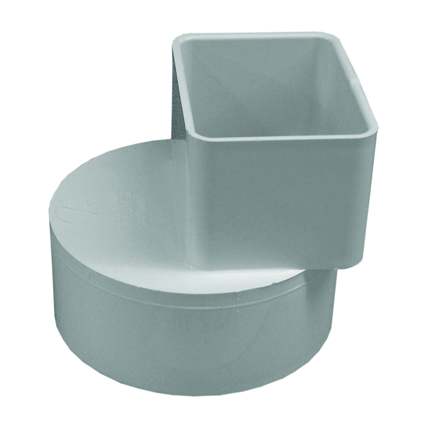 Offset flush fit downspout adapter. Used to connect rain gutter downspouts to underground sewer piping. Fits over 4 in sewer pipe. Size: 2 in x 3 in x 4 in.