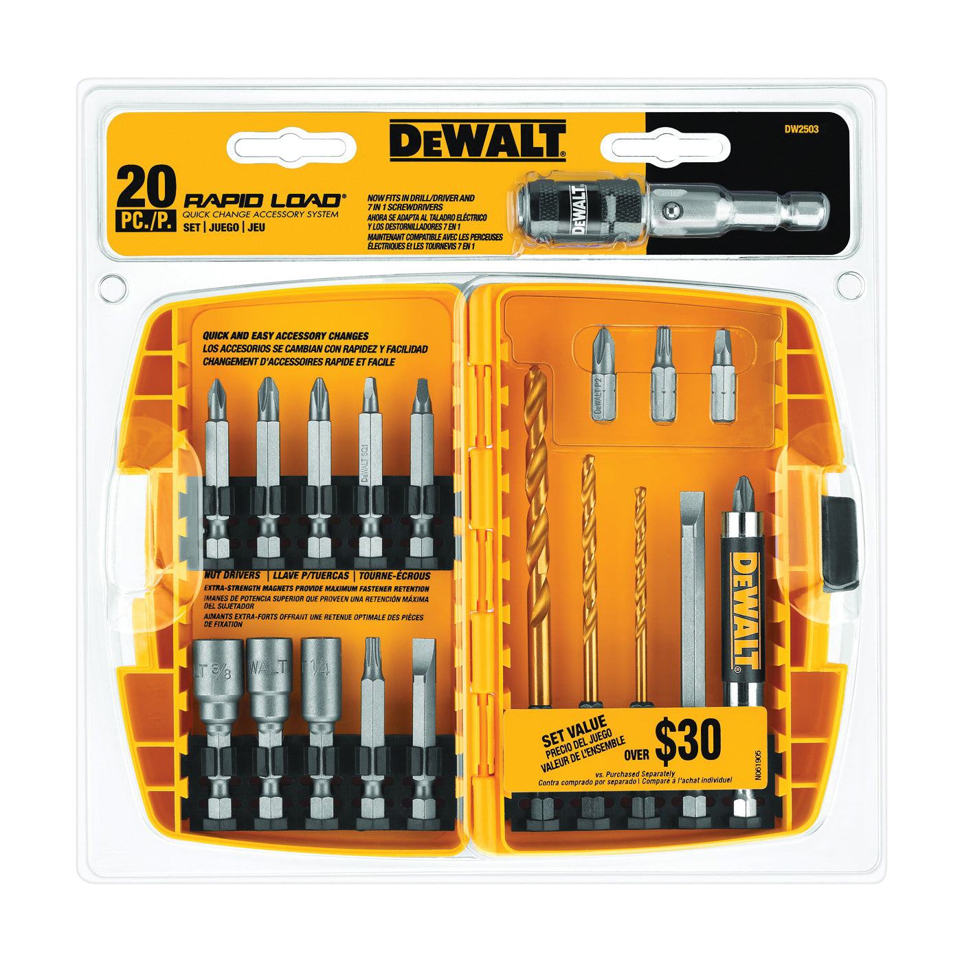 | Includes | (1) Rapid Load Head, (7) 2 in Power Bits, (3) Nut Setters, (3) Titanium Drill Bits, (1) 3-1/2 in Power Bit, (1) Magnetic Drive Guide and (4) 1 in Insert Bits |