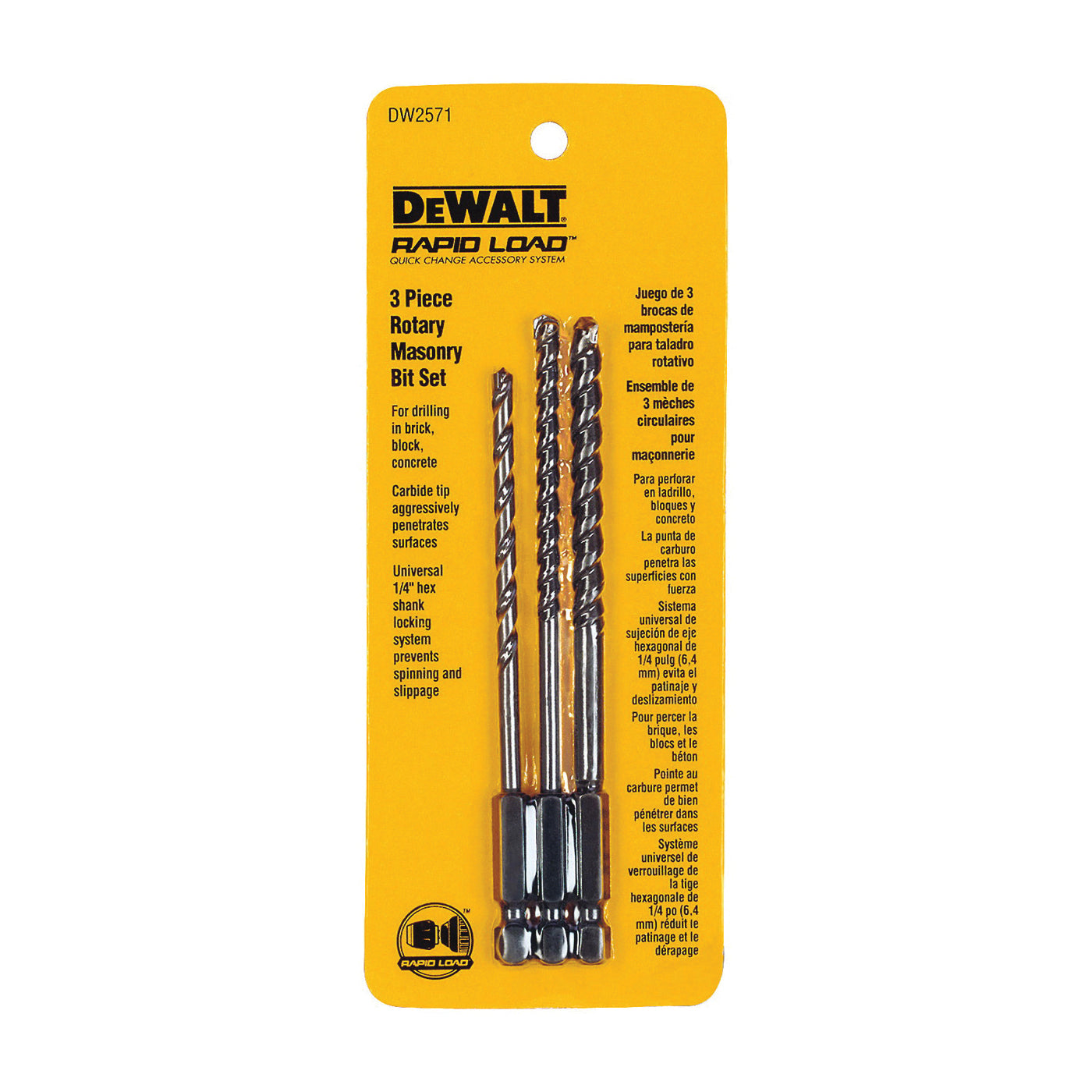 Carbide tipped for applications such as drilling in brick, block and concrete, rapid load quick change; universal 1/4 in hex shank prevents slipping. Includes one 5/32 in, 3/16 in and 1/4 in bits.