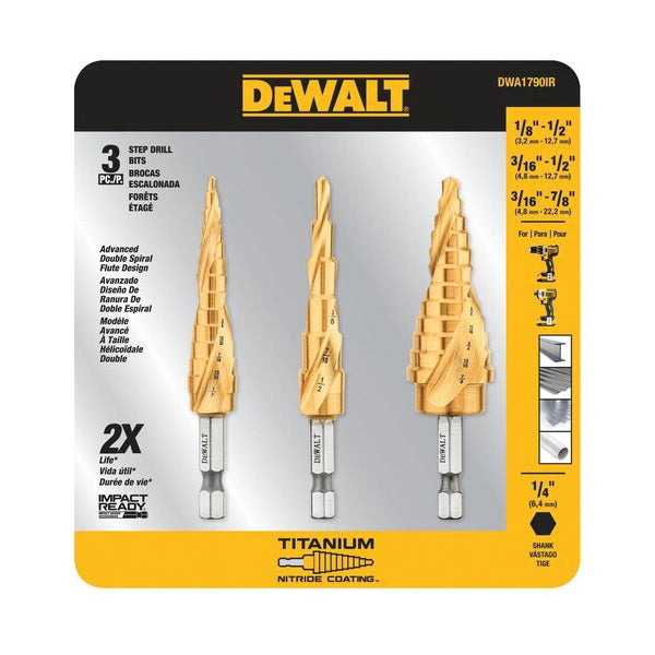The DeWALT step drill bit set features three innovative Titanium Nitride Coating step drill bits to power through a range of applications. Each bit is equipped with a split-point tip that helps to increase speed and starts on contact. An innovative double-spiral flute design delivers long life and outstanding chip removal. Laser-engraved numbers helps to increase step visibility. Optimized for impact drivers. Works with rotary drills.