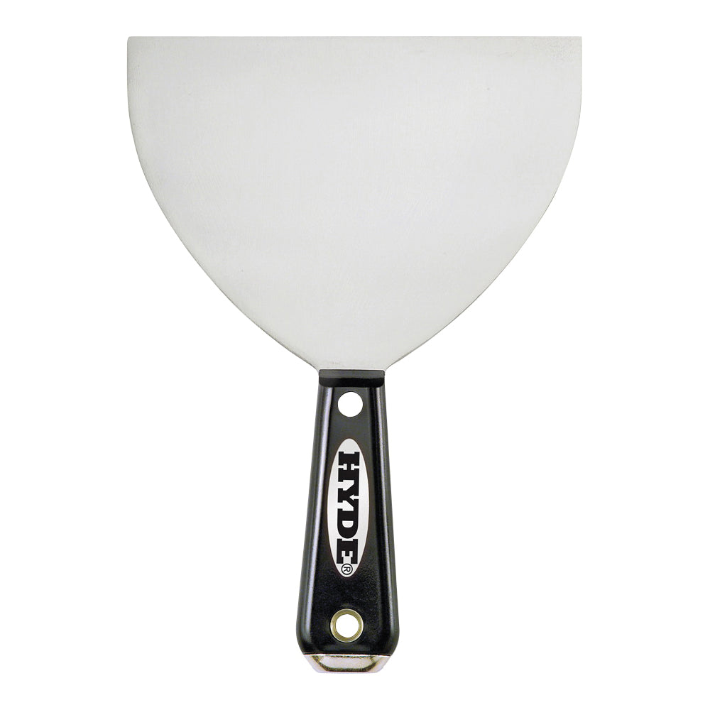 6 in flexible blade with desired flex point for applying and smoothing compound and taping joints. Black & Silver® joint knife with high-carbon steel blade. Durable nylon handle with hammer head end for setting popped nails and screws as you work. Full-tang blade.