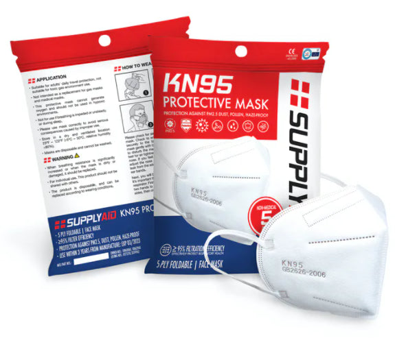 Supplyaid's KN95 5-ply foldable mask is suitable for adult's daily travel protection. The KN95 mask is not to be used as a replacement for gas masks or as a medical mask. The mask cannot generate oxygen and should not be used in hypoxic environments. When used properly, the mask provides approximately 95% filter efficiency and effectively protects respiratory health. Use the KN95 mask to protect against PM2.5, dust, pollen, microorganisms and air pollution. Use the mask within 3 years of manufacturer and should be stored in dry and ventilated location 23 to 122 deg F (relative humidity <80%).