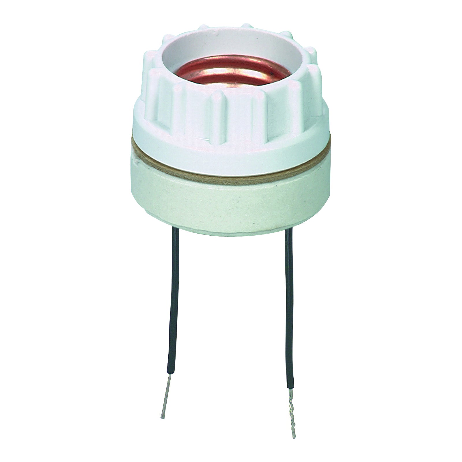 High-strength insulator porcelain. Thermoset ring. 2-piece with 9 in wire leads, medium base, keyless switch.
