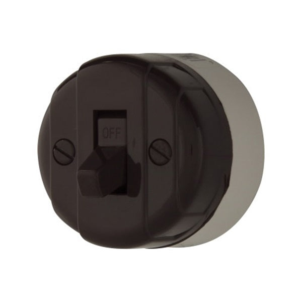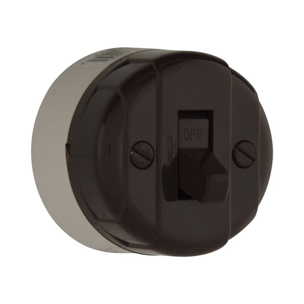 Surface mount, side wire, feed-through heavy-duty plastic construction switch for SPT cord, 10 A at 125 V, 5 A at 250 V.