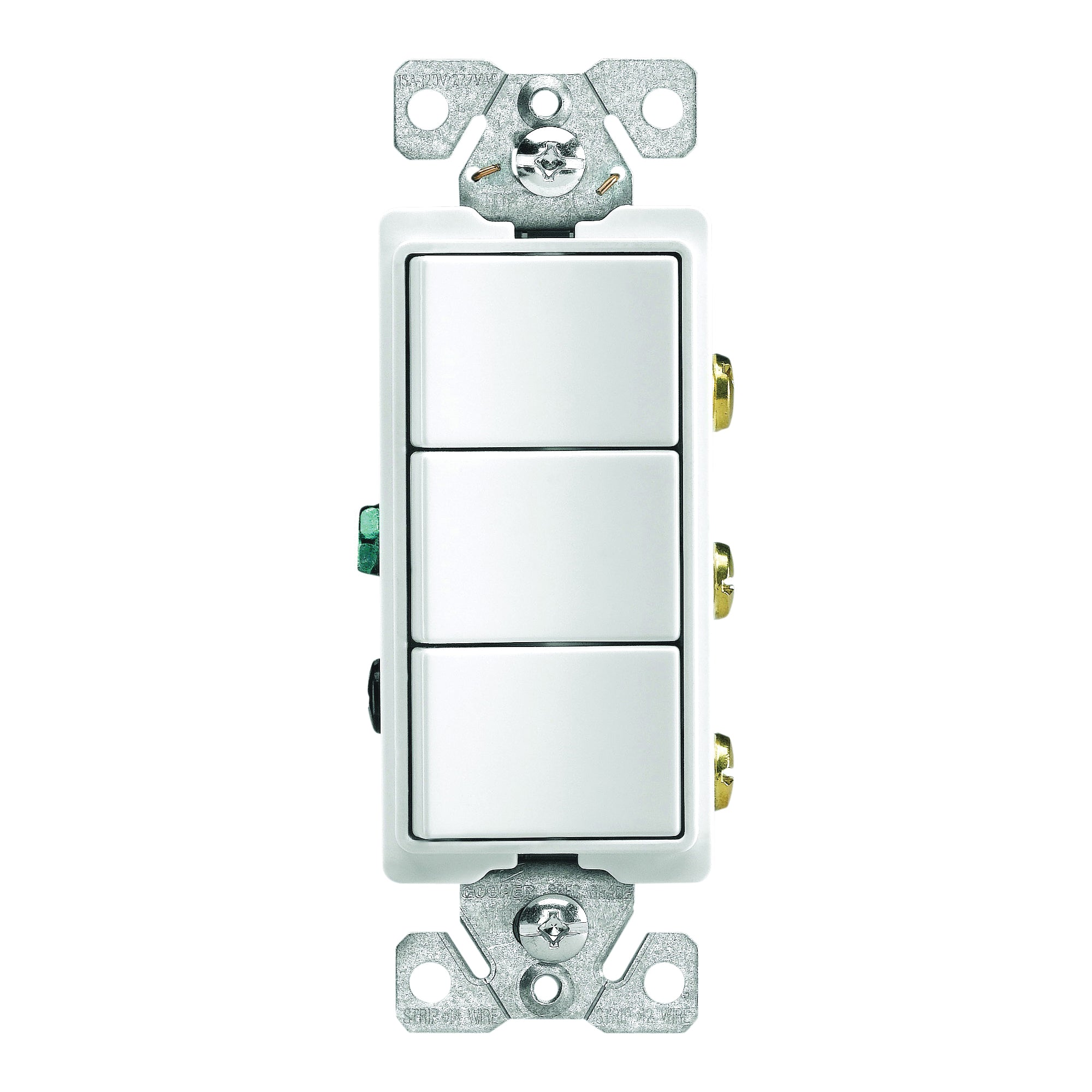 High-impact-resistant thermoplastic rocker, top and back body. Injection molded housings and PVC resin, comply with UL94 V0 flammability ratings. Tri-combo screw heads, built-in wire stripper. Backwire clamps on side terminals for installation of #12 and #14 wire. Terminal screws are backed out for easier and faster wiring. Thick (0.045 in/1.14 mm) steel mounting strap is zinc-plated. Automatic grounding system eliminates the need for bonding jumper in grounded metal enclosure and provides redundant measure of ground continuity where a jumper is used. 120/277 VAC, 15 A rocker switches with break-off provision for wiring devices on the same circuit or on separate circuits. UL, cUL listed and NOM 426 rated.