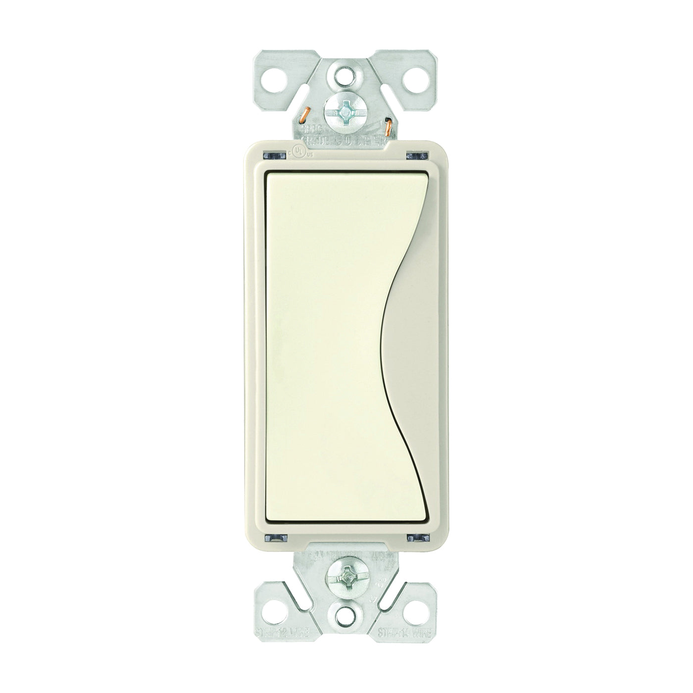 Curved profile rocker, accented by the color and texture of its surrounding frame, with two-tone elegance. Virtually unbreakable, ultrasonically welded top and back body, extra-long, extra-wide mounting straps, #14 push-in terminals, backwire clamps on side terminals, easy-access ground screws and built-in wire strippers. 15 A, 120/277 V.