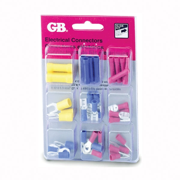 Slide-card kit with 40 assorted terminals and disconnects. Butt splices: Five 22-16 AWG red, four 16-14 AWG blue, three 12-10 AWG yellow. Ring terminals: Six 22-16 AWG red, four 16-14 AWG blue. Spade terminals: Five 22-16 AWG red, three 12-10 AWG yellow. Female disconnects: Five 22-16 AWG red, five 16-14 AWG blue.