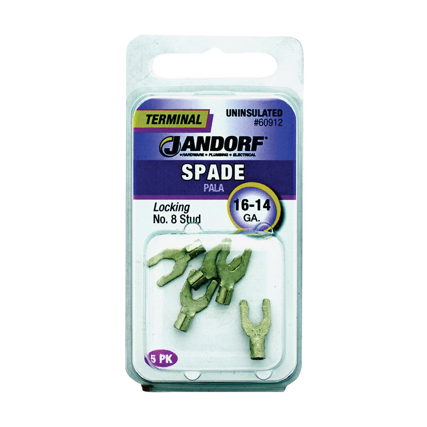 Jandorf Spade Terminal, 600 V, Wire Size: 16 to 14 AWG, Contact Material: Copper, Contact Coating: Tin, Stud Size: #8
