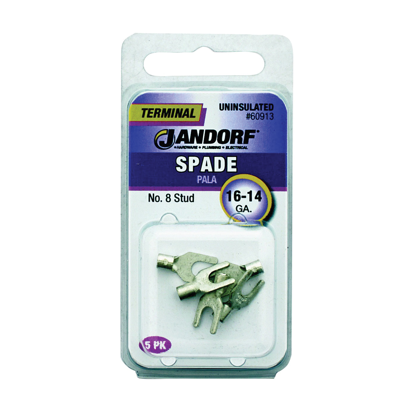 Jandorf Spade Terminal, 600 V, Wire Size: 16 to 14 AWG, Contact Material: Copper, Contact Coating: Tin, Stud Size: #8
