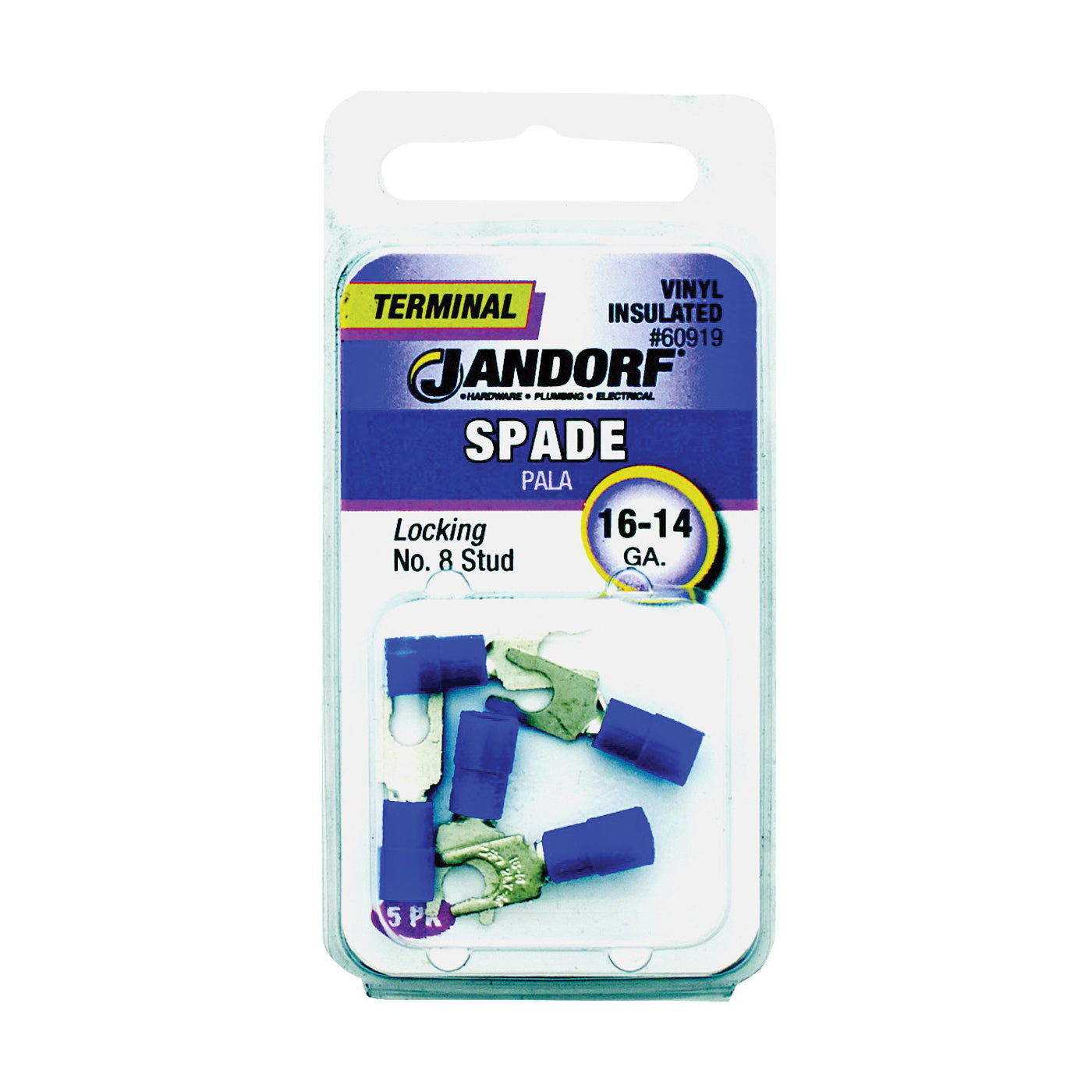 Jandorf Spade Terminal, 600 V, Wire Size: 16 to 14 AWG, Insulation Material: Vinyl, Contact Material: Copper, Contact Coating: Tin, Stud Size: #8, Blue