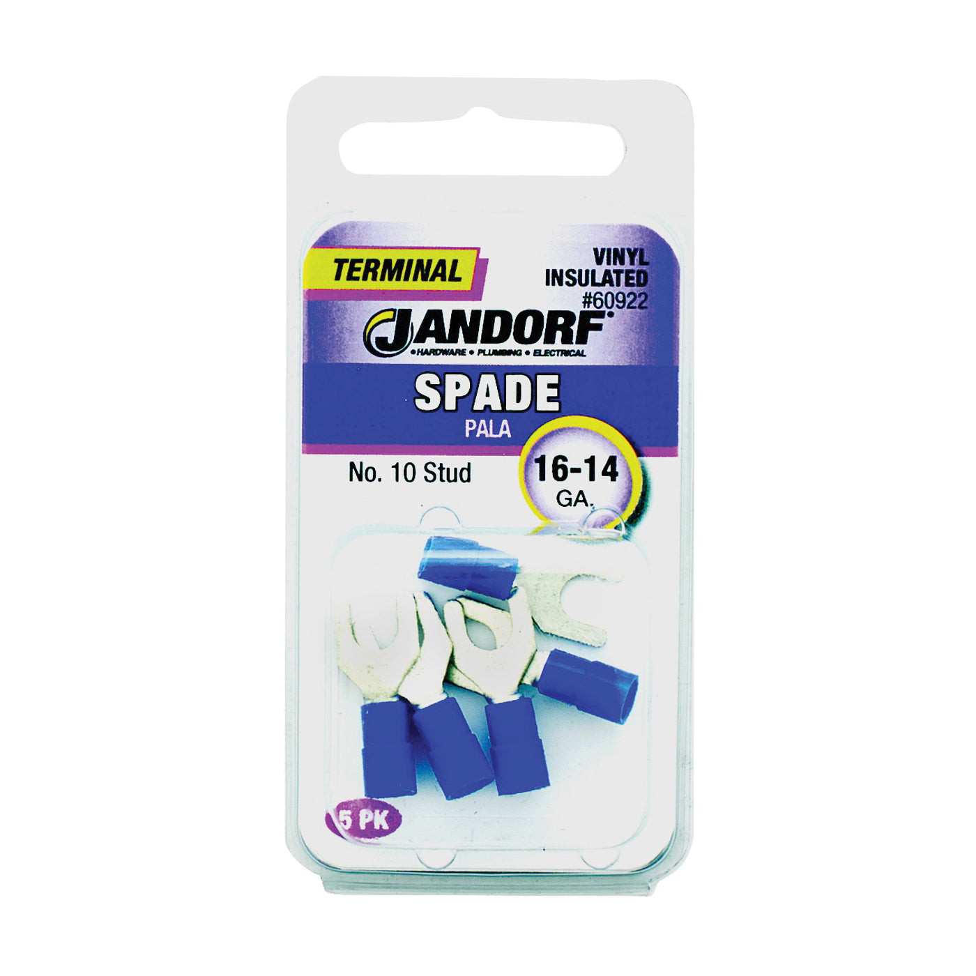 Jandorf Spade Terminal, 600 V, Wire Size: 16 to 14 AWG, Insulation Material: Vinyl, Contact Material: Copper, Contact Coating: Tin, Stud Size: #10, Blue