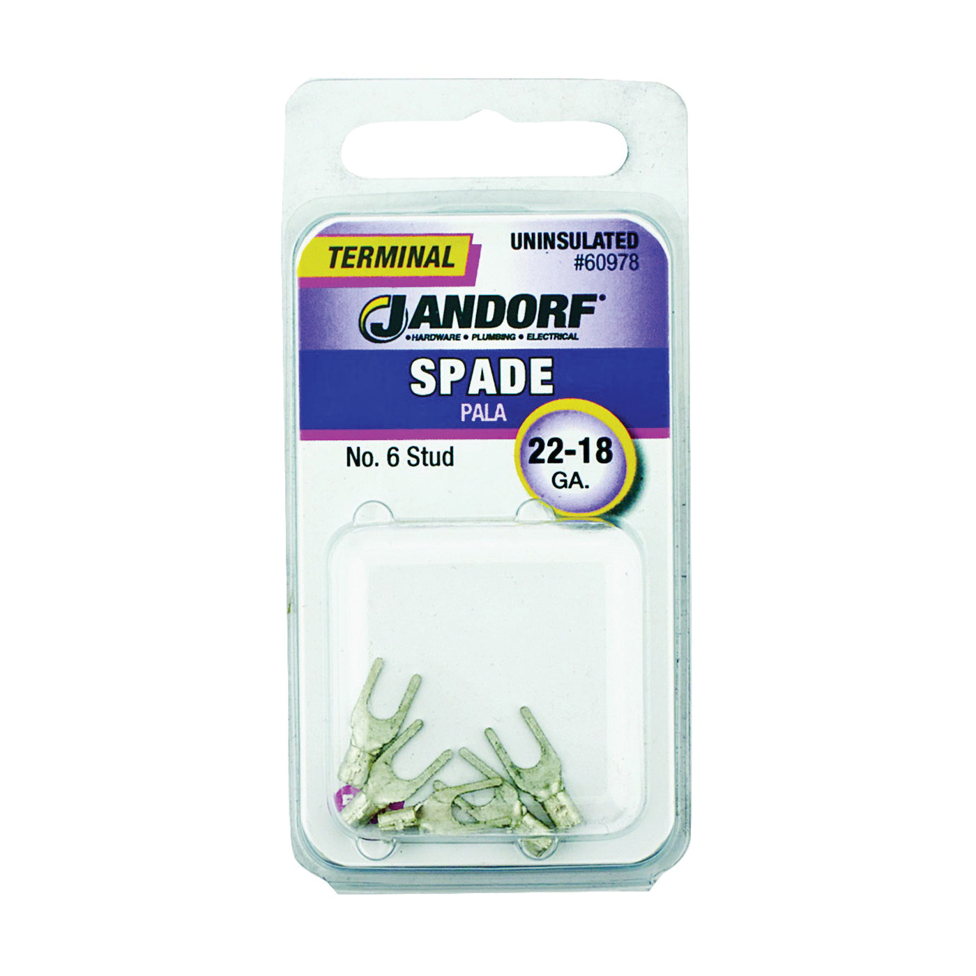 Jandorf Spade Terminal, 600 V, Wire Size: 22 to 18 AWG, Contact Material: Copper, Contact Coating: Tin, Stud Size: #6