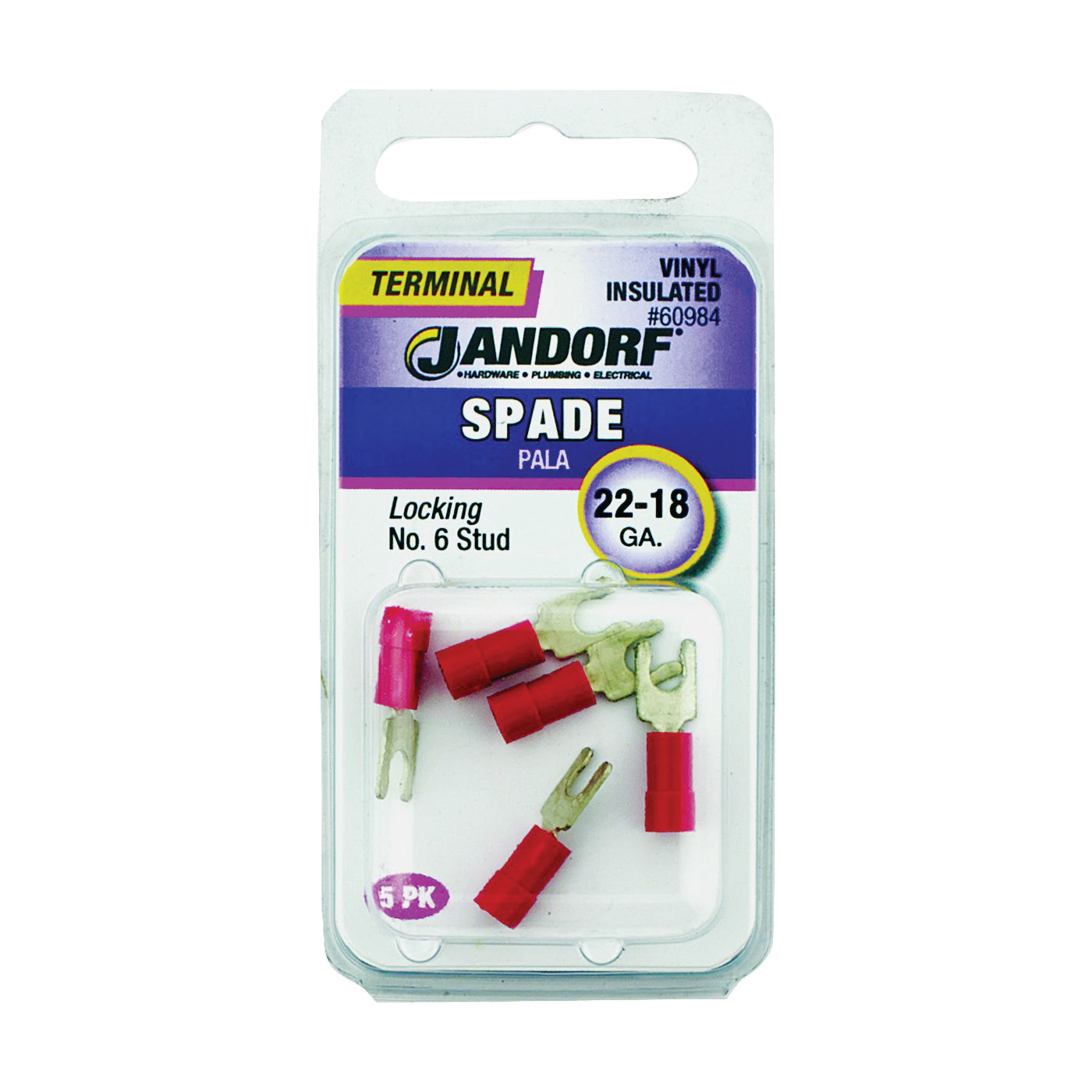 Jandorf Spade Terminal, 600 V, 22 to 18 AWG Wire, Copper Contact, Tin Contact Coating, #6 Stud, Red