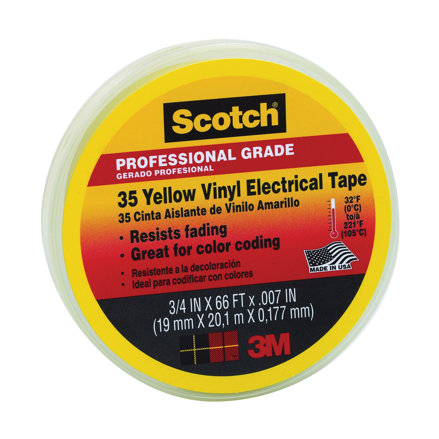 Scotch® 35 Yellow vinyl electrical tapes offer premium-grade quality and superior adhesion ideal for projects requiring color coding. 3M™ Scotch® 35 colored vinyl electrical tapes are highly flexible, stretchy and conformable to virtually any shape requiring color coded insulation. 3M™ Scotch® 35 yellow vinyl electrical tapes are a great choice for your next project inside or out.