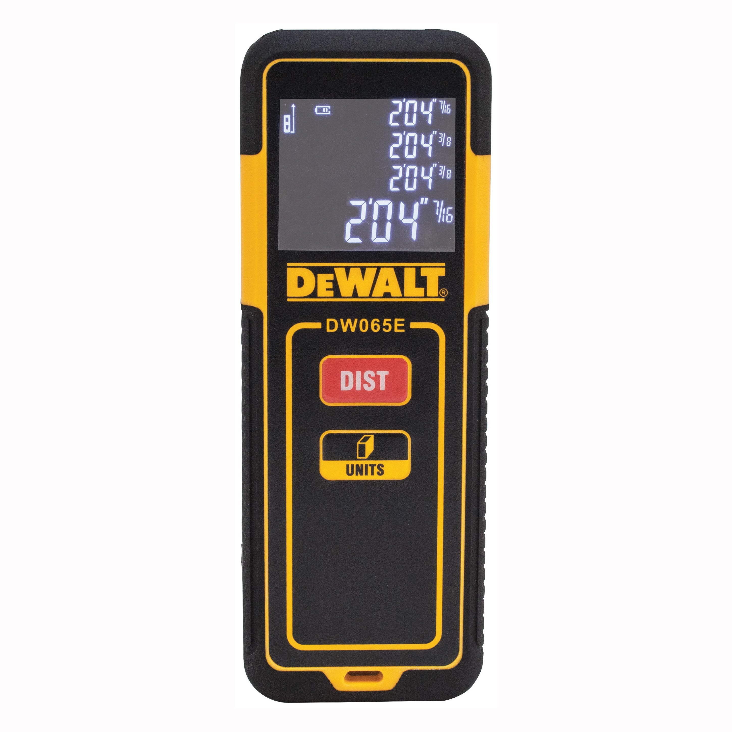 The DW065E 65 ft laser distance measurer has a compact, lightweight design, a high-contrast, easy-to read digital display and the ability to calculate area and volume in an easy-to-use package.
