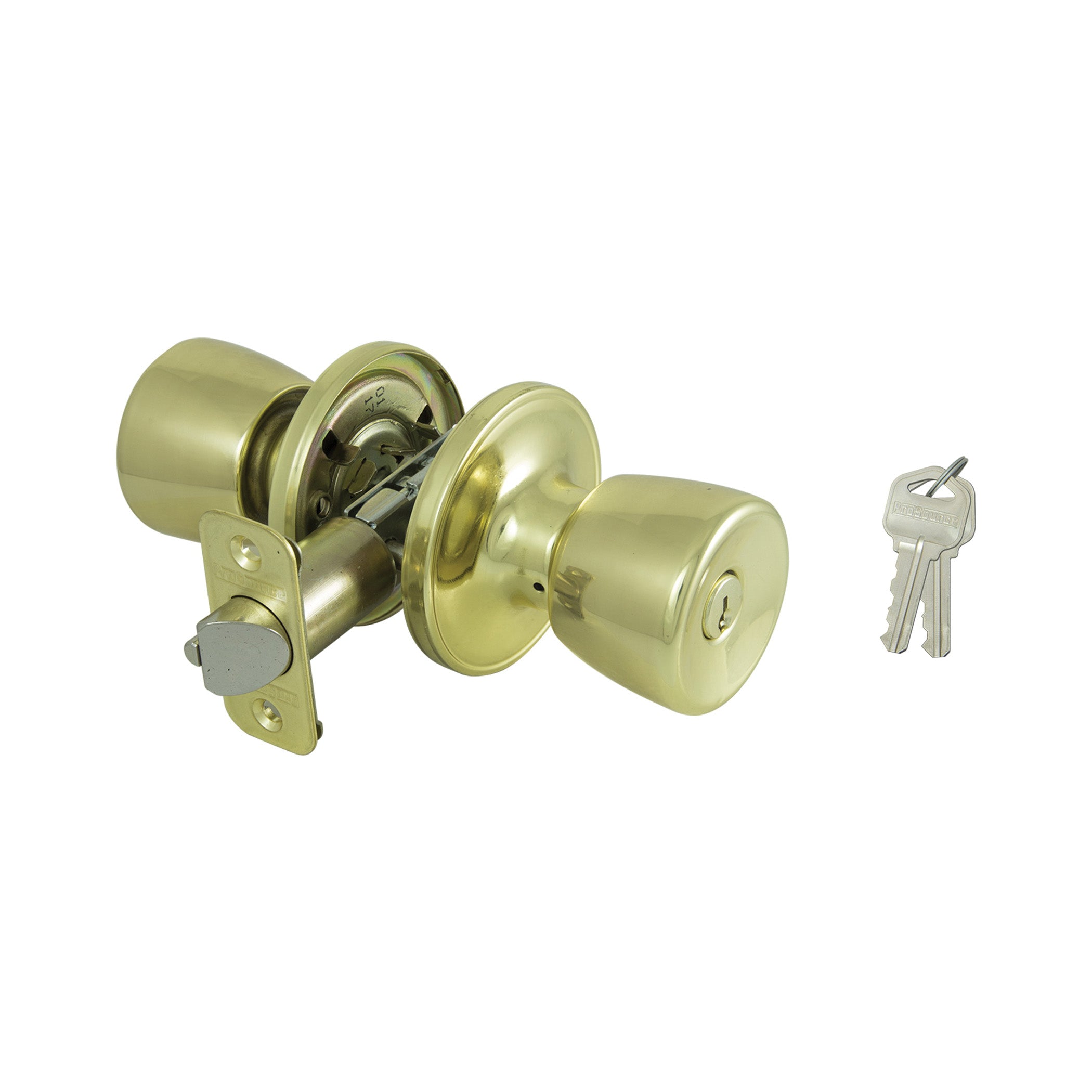 For keyed exterior doors. Both knobs lock or unlock by key outside or turn button inside. All metal components. Solid steel latch assembly. Rust-resistant solid brass keyway for more security. Seamless 1-piece knob for extra strength. Square spindle for right or left handed installations. Easy installation. Cylinder drilled for construction keying. Door prep 2-1/8 in Crossbore, 1 in Edge Bore, 1 x 2-1/4 in Latch Face. Fits 1-3/8 to 1-3/4 in doors.