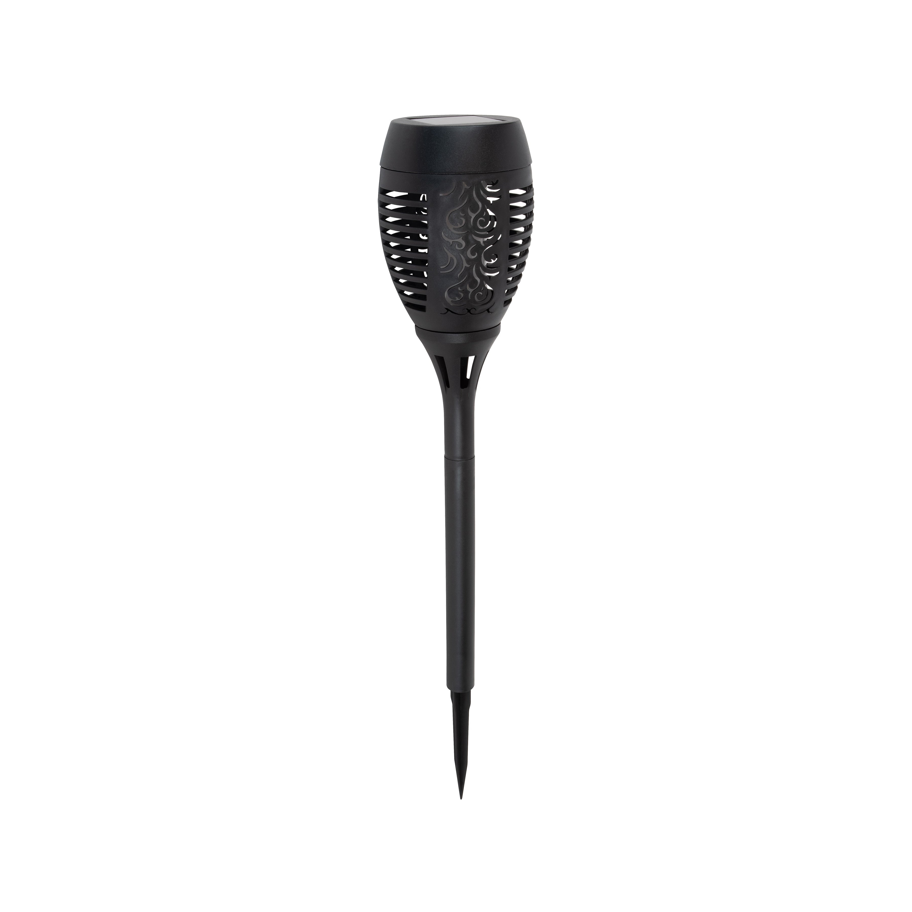Solar TIKI torch light feature a small flame and 5 lumens. Plastic construction. Black color. Batteries included.