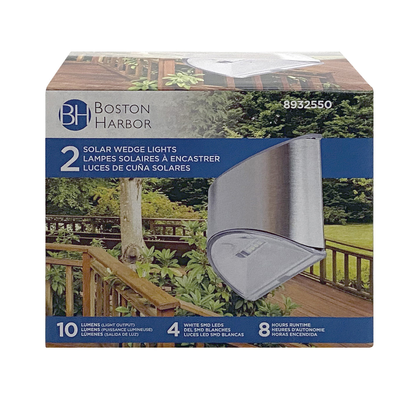 Solar wedge light features 5 lumens. Steel and plastic construction. Stainless steel color. Batteries included.