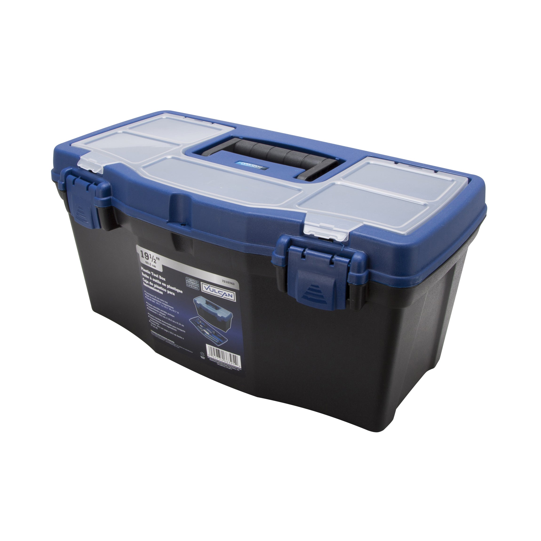 The Vulcan tool box is ideal to use for all tools and small parts. It has built-in organization compartments with a convenient lift out carry tray. Made of plastic. Outside dimensions: 19-1/2 in L x 10-1/2 in W x 9-1/2 in H.