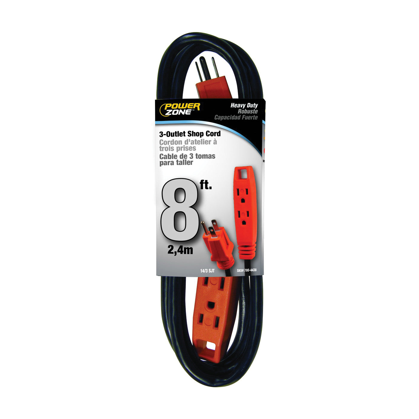 • PowerZone OR890708 Extension Cord, 8 ft L, Grounded Plug, 3 -Outlet, Receptacle Outlet, 15 A, 125 V