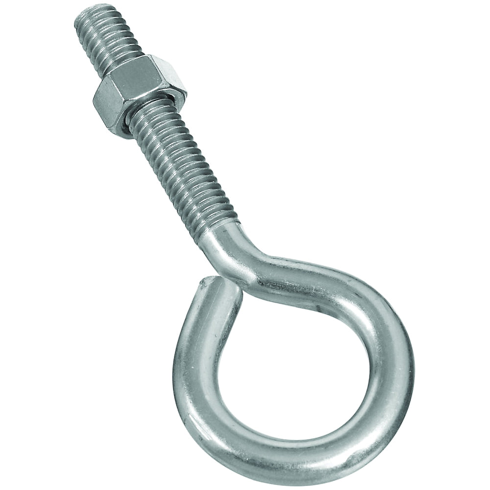 National Hardware Eye Bolt, Thread Size: 3/8-16, Thread Length: 2 in, Shank Diameter: 0.33 in, Shank Length: 2.35 in, Eye Diameter: 1 in ID, 4 in OAL, Working Load Limit: 160 lb, Stainless Steel, Stainless Steel, Includes: Hex Nut