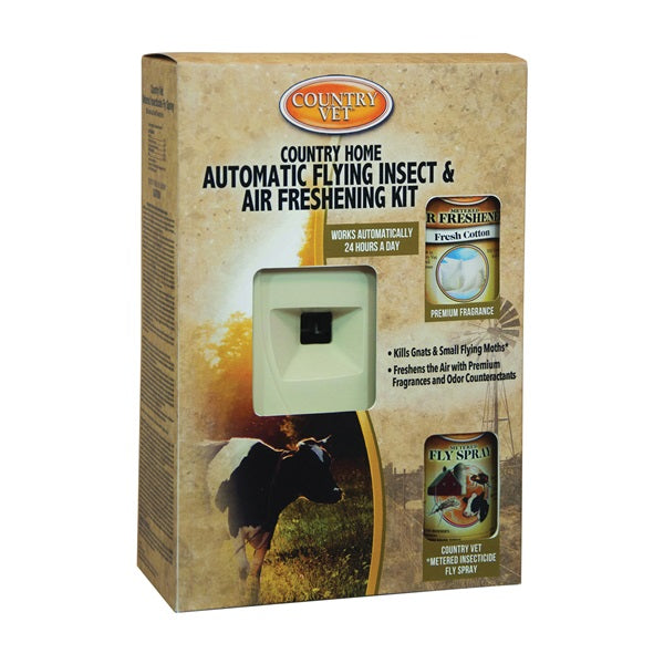 30 days of 24 hrs air fragrance and 30 days of 24 hrs flying insect control. Fully automatic. Controls flies, mosquitoes and moths for 30 days and air freshener and odor control for 30 days. EPA registered, USDA authorized, F-1 rated. Includes one each wall dispenser, metered fly spray refill and metered air freshener refill.