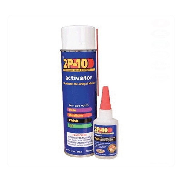 The 2P-10 solo kit contains 2 oz 2P-10 thick adhesive and 12 oz activator. 2P-10 is a two-part ten-second adhesive. Just apply the adhesive, then spray the activator and stick it together.