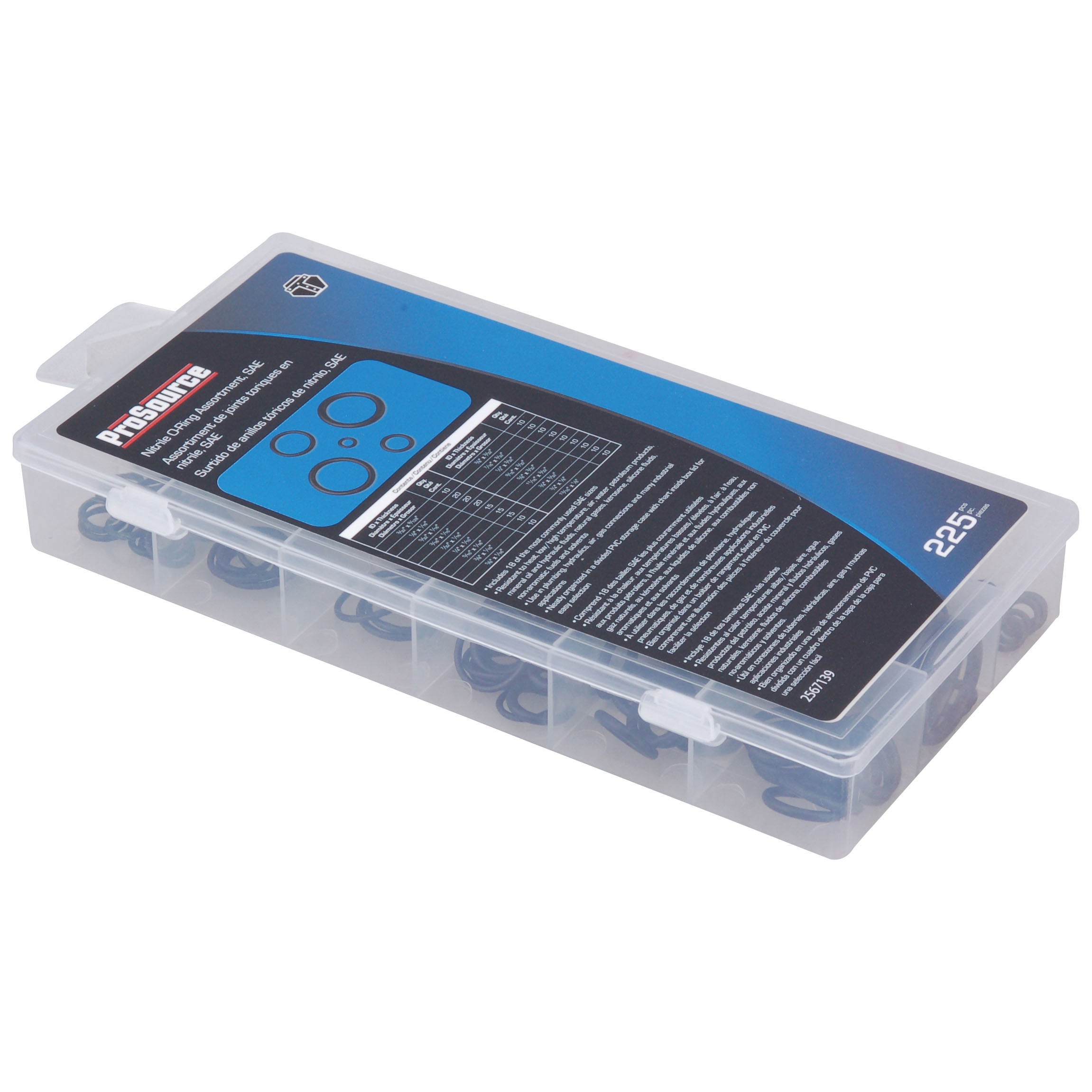 ProSource O-Ring Assortment, SAE, NBR, Black, Includes: 10 PC A005 3/32 x 15/64 x 9/128 in, 20 PC A006 1/8 x 1/4 x 1/16 in, 20 PC A007 5/32 x 9/32 x 1/16 in, 20 PC A008 3/16 x 5/16 x 1/16 in, 15 PC A009 7/32 x 11/32 x 1/16 in, 15 A010 1/4 x 3/8 x 1/16 in, 10 PC A113 9/16 x 3/4 x 3/32 in, 10 PC A114 5/8 x 13/16 x 3/32 in, 10 PCA 115 11/16 x 7/8 X 3/32 in, 10 PC A 116 3/4 x 15/16 x 3/32 in, 10 PC A210 3/4 x 1 x 1/8 in, 10 PC A211 13/16 x 1/16 x 1/8 in, 15 PC A011 5/16 x 7/16 x 1/16 in, 10 PC A012 3/8 x 1/2 x 1/16 in, 10 PC A016 5/8 x 3/4 x 1/16 in, 10 PC A110 3/8 x 9/16 x 3/32 in, 10 PC A111 7/16 x 5/8 x 3/32 in, 10 PC A112 1/2 x 11/16 x 3 X 32 in, 10 PC A005 3/32 x 15/64 x 9/128 in, 20 PC A006 1/8 x 1/4 x 1/16 in, 20 PC A007 5/32 x 9/32 x 1/16 in, 20 PC A008 3/16 x 5/16 x 1/16 in, 15 PC A009 7/32 x 11/32 x 1/16 in, 15 PC A010 1/4 x 3/8 x 1/16 in, 10 PC A119 9/16 x 3/4 x 3/32 in & 10 PC A114 5/8 x 13/16 x 3/32 in